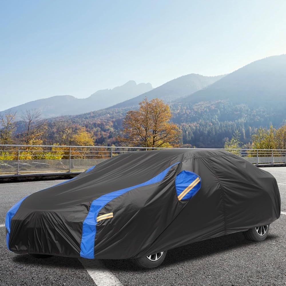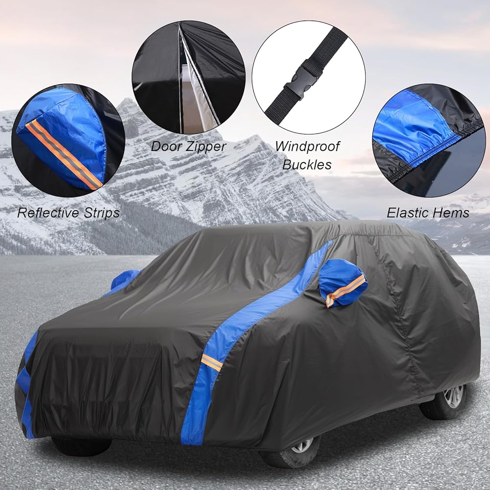 غطاء سيارة لجميع الأحوال الجوية للشمس والمطر غطاء سيارة SUV مقاوم للماء لجميع الأحوال الجوية أغطية خارجية كاملة، غطاء سيارة لسيارات الدفع الرباعي بطول يصل إلى 170 بوصة (أسود وأزرق، مقاس B1)