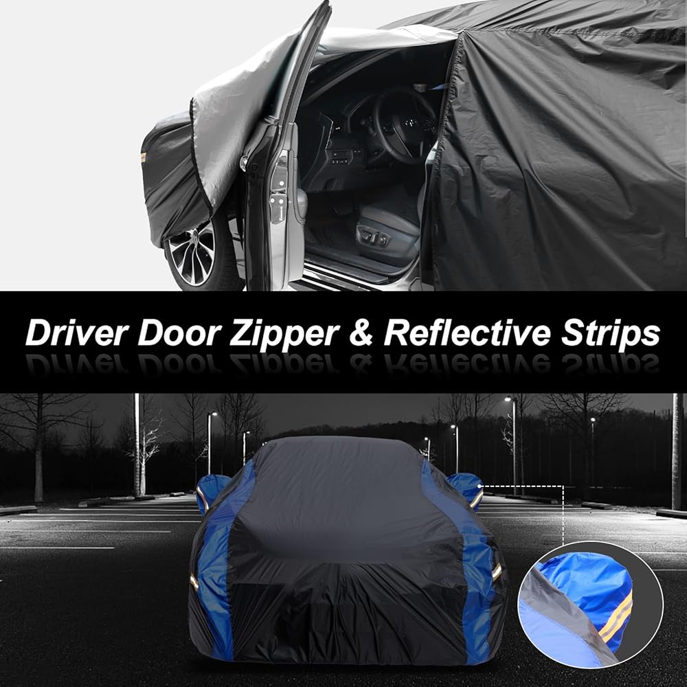 【تصميم احترافي】 تم تصميم هذا الغطاء الخارجي الكامل بسحاب باب السائق، وجيوب مرآة الرؤية الخلفية و6 قطع من الأشرطة العاكسة. تم خياطة شريطين مقاومين للرياح بإحكام على غطاء السيارة لتثبيته في الرياح العاتية.