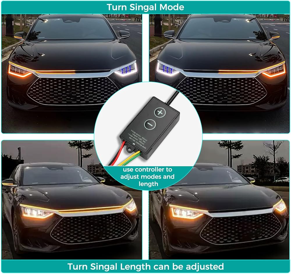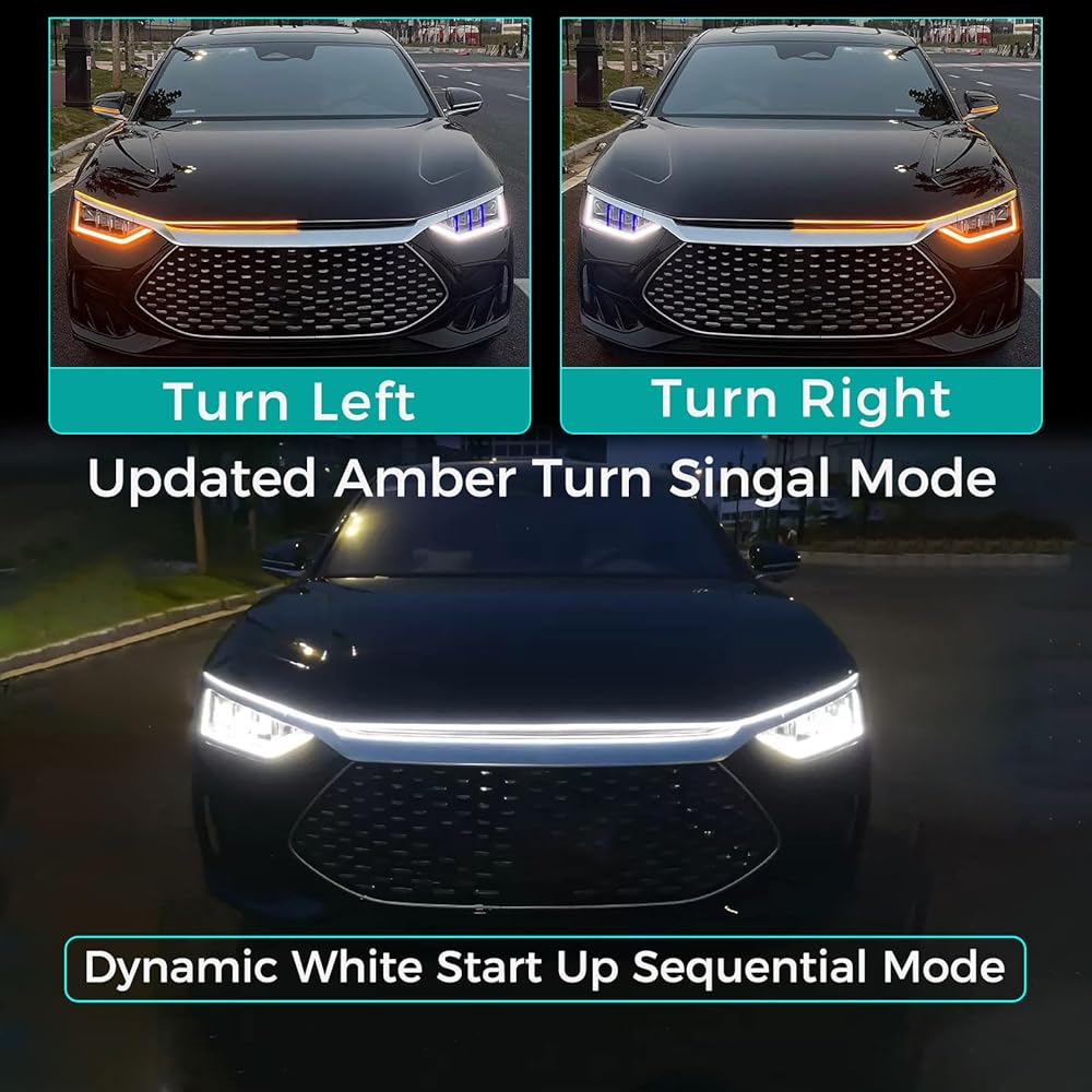 🚗 وظيفة إشارة الانعطاف المحسنة: يعمل شريط ضوء غطاء السيارة SilverHolder تلقائيًا مع تأثير المسح الديناميكي عند بدء تشغيل السيارة، ويظل في وضع الإضاءة المستمر عند القيادة. عند الدوران يمينًا/يسارًا، سيبدأ تأثير التدفق الكهرماني. إنه يتزامن مع مصابيح إشارة الانعطاف، ويعمل كضوء تشغيل نهاري، وضوء إشارة الانعطاف.