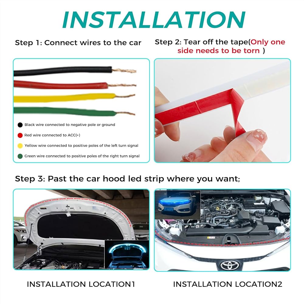 🚗 التثبيت: قم بتوصيل السلك الأسود بالقطب السالب والسلك الأحمر بـ Acc (+). قم بتوصيل الأسلاك الصفراء/الخضراء بالأقطاب الموجبة لمصابيح إشارة الانعطاف اليسرى واليمنى على التوالي. يوجد غراء قوي على جانبي شريط الضوء، وهو ناعم ومرن. يمكن توصيله بفجوة الغطاء دون تغيير الأسلاك. طريقة مثالية لإضافة مظهر مخصص مذهل لسيارتك.