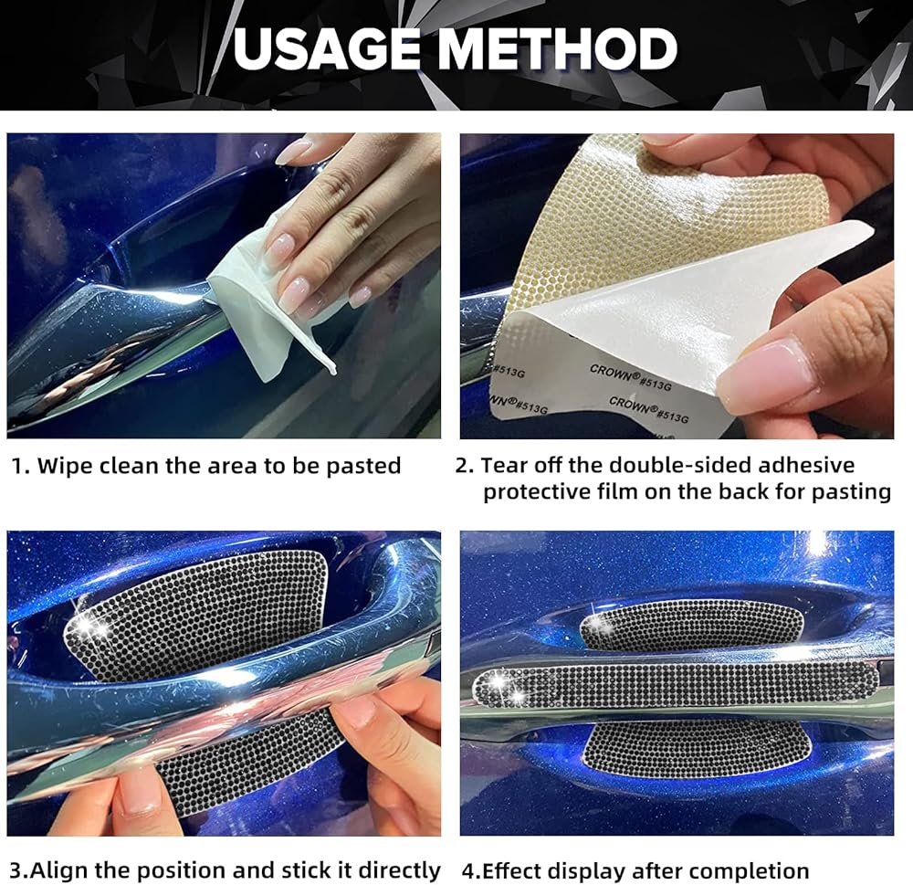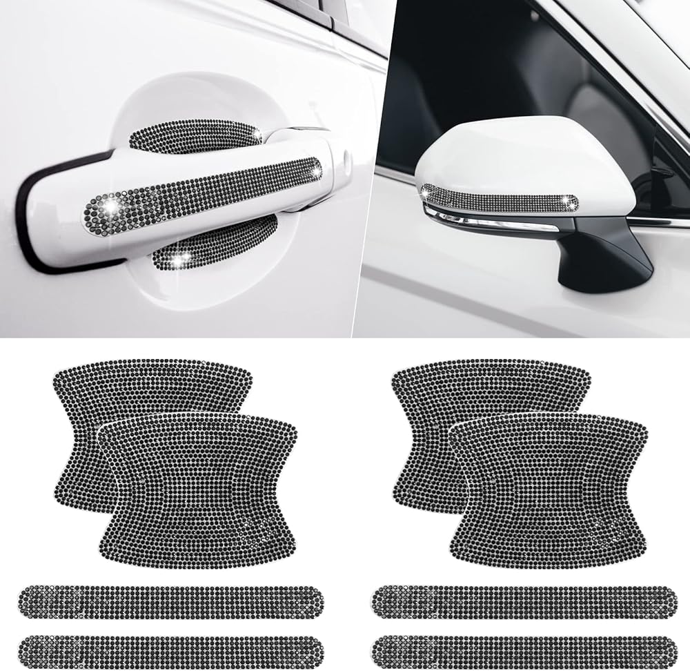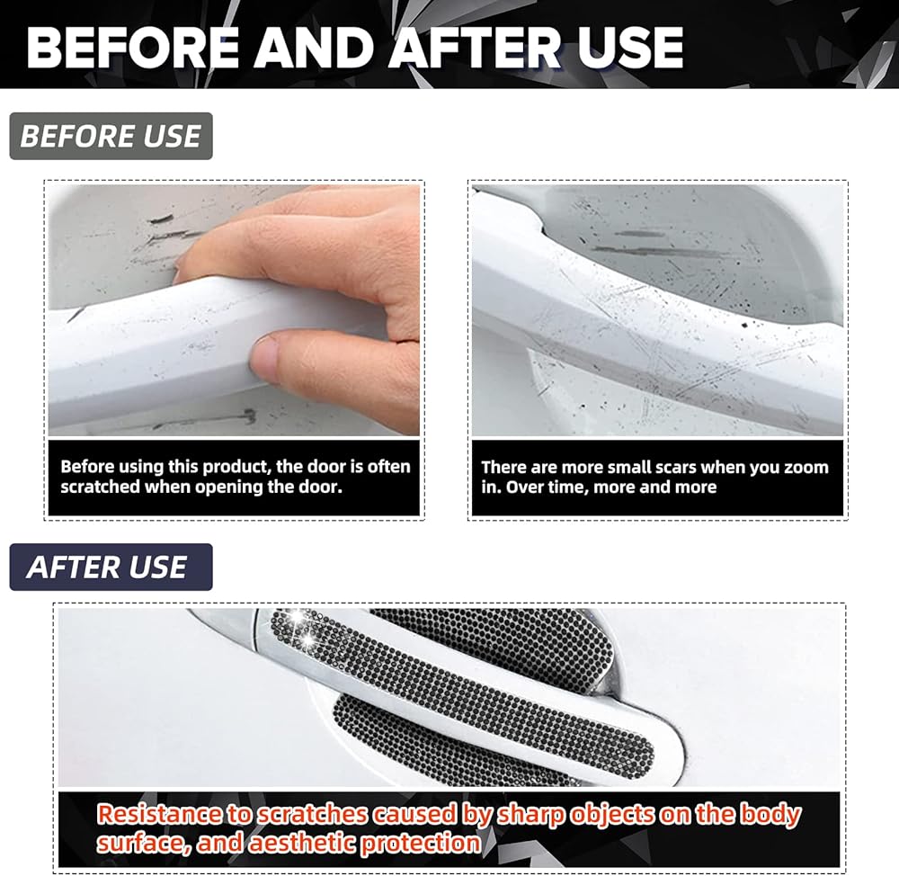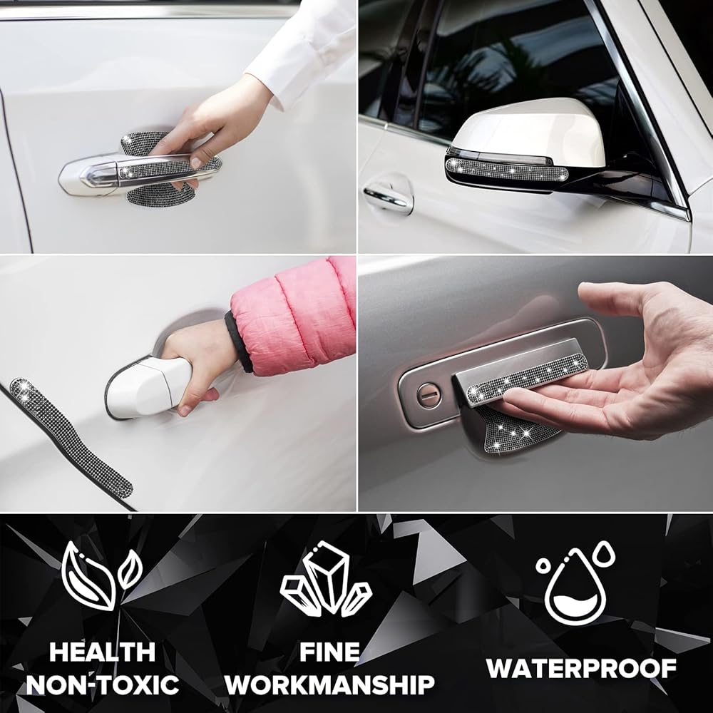 【إكسسوارات السيارة اللامعة】 مصنوعة من أسطح متعددة القطع وأحجار الراين عالية الكثافة، ستمنحك ملصقات مقبض باب السيارة المصنوعة من حجر الراين المتلألئ تأثيرًا لامعًا على سيارتك! هذه الملصقات قادرة على تقديم تأثيرات لامعة مختلفة تحت أضواء مختلفة، مما يجعل السيارة مميزة. يمكن أيضًا استخدام واقي الخدش لمقبض الباب هذا كتحذير من تأثير الانعكاس الليلي لضمان سلامة القيادة.