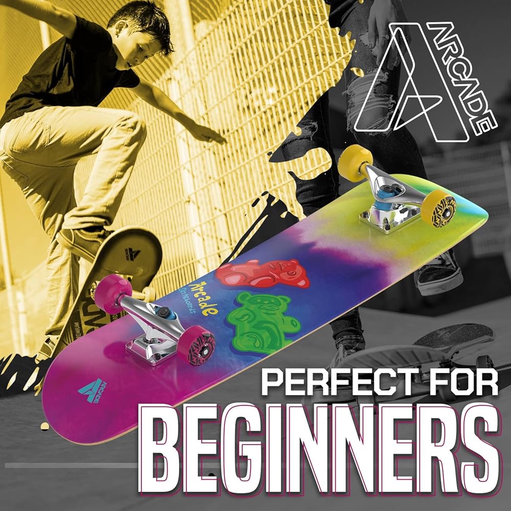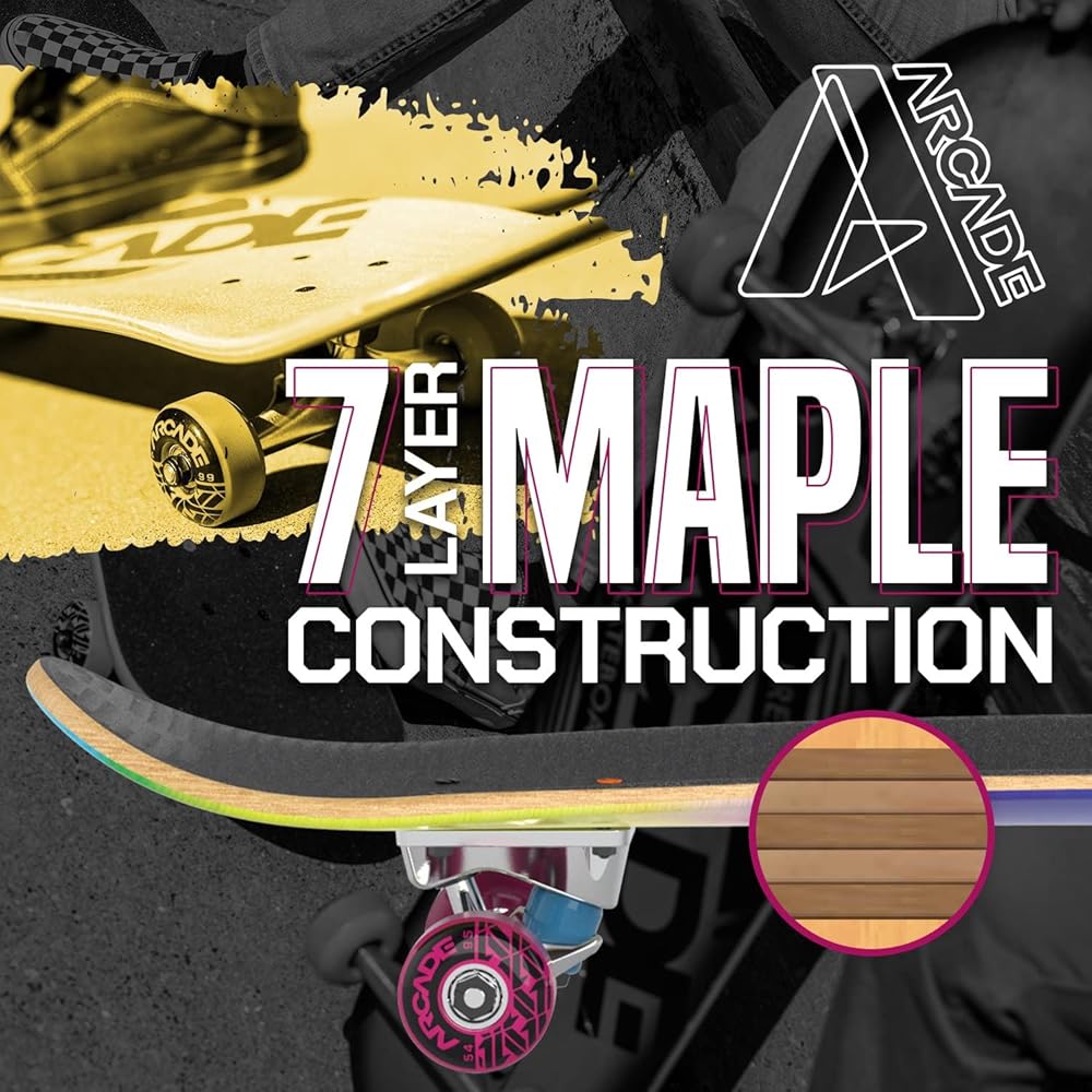 🛹 WHO'S IT FOR? Arcade Pro Skateboards are for ALL beginners! They're skateboards for kids and also skateboards for adults who know that ANY time is the BEST time to learn! Your Arcade Pro Skateboard can hold 220lbs, built for any height and with a 7.75 x 31.25 inch deck, takes up to size 12 shoes.