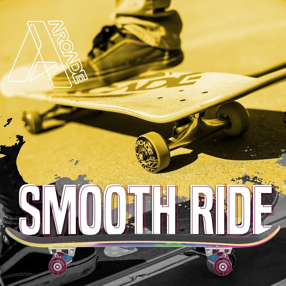 🛹 START SKATING, LIKE A PRO! For a beginner skateboard that feels like anything BUT, we designed the Arcade Skateboard! This pre-assembled board is flexi enough for learning tricks and flips, while precision trucks, bearings, axles and wheels give you the freedom to practice turning and carving without getting stuck!