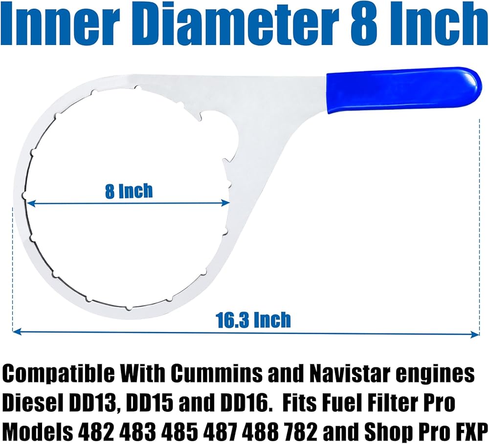 يبلغ قطر مفتاح فلتر الوقود الداخلي 6 بوصة. متوافق مع محركات شاحنة Cummins من ديترويت ديزل 380134، 382. يناسب موديلات فلتر الوقود Pro 230، 232، 233، 234، 242، 243، 245، وShop Pro ST.