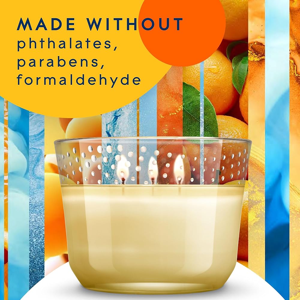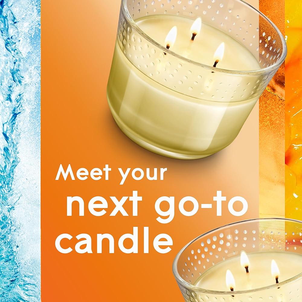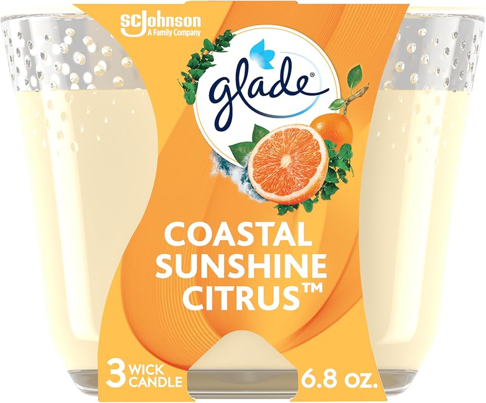 Meet your next go-to candle, and reward your ritual. The Glade Coastal Sunshine Citrus three wick candle is just what you need to ignite your self-care routine. Surround yourself with scent that's been expertly crafted by master perfumers. Whether it's Me-time with a book or a long luxurious bath, these Glade jar candles will help make happiness your Mood of the Moment™. The fragrance is infused with essential oils and features notes of coastal air, a splash of citrus and a pop of pineapple. You'll definitely want to take a second smell and set a happy vibe. While you're relaxing, it's also good to know that these large scented candles are made without phthalates, parabens, formaldehyde or nitro musks. The warm glow and crafted scent quickly create a special atmosphere. So go ahead and discover the expertly crafted Glade candle collection. It delivers the scent treat you've been searching for. With the Glade Coastal Sunshine Citrus candle, you've found your self-care soulmate. Candle burning tips: For best performance, burn two to four hours at a time. This will maximize the life of your candle. Trim the wick to 1/4 inch each time before you burn, and be sure to remove any wick debris in the candle before lighting. Do not touch, lift or move a burning candle. Wait until the wax has cooled and hardened before touching a candle. For optimal performance, keep burning candles away from drafts, vents and air currents. Stop using your Glade Jar Candle when 1/4 inch of wax remains. Be sure the candle jar is placed on a stable, heat-resistant surface. Never place flammable materials near a candle. Never burn candles unattended. Do not burn candles where they can be knocked over by children, pets or anyone else.
