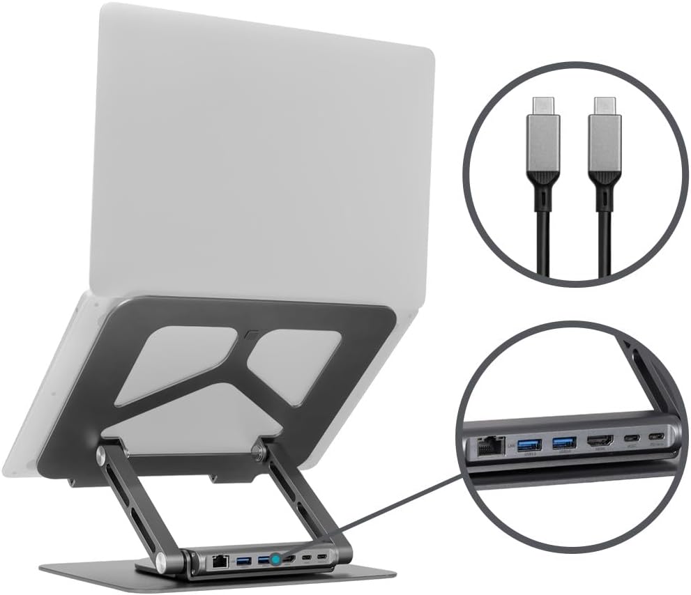 حامل كمبيوتر محمول Monoprice 6 في 1 Z-Fold وقاعدة إرساء USB-C قابلة للفصل مع 4K HDMI وقاعدة دوارة 360 درجة، RJ45 Gigabit Ethernet، معدل نقل يصل إلى 5 جيجابت في الثانية