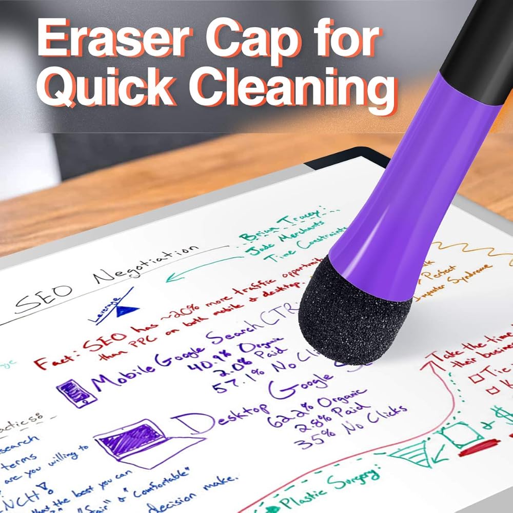 【رأس رفيع لأقلام التحديد الجافة الرفيعة】 توفر لك أقلام المسح الجافة الرفيعة مقاس 1 مم تجربة كتابة مريحة وسلسة، وليس غير واضحة. الحبر عالي الصبغة خالٍ من الزيلين والتولوين، ومنخفض الرائحة، وسريع الجفاف وخالي من البقايا، ويمكن مسحه من السبورة البيضاء والأسطح الملساء مثل الزجاج والمرايا.