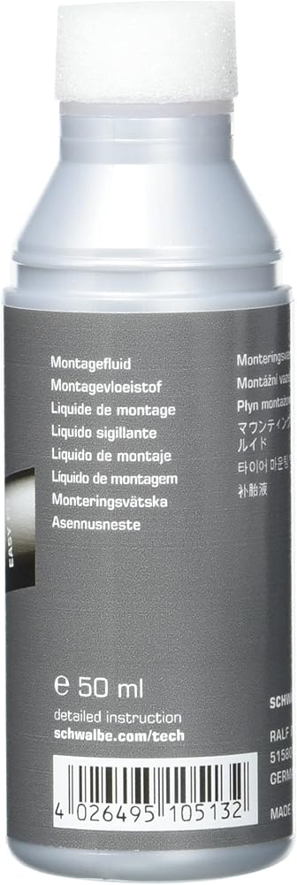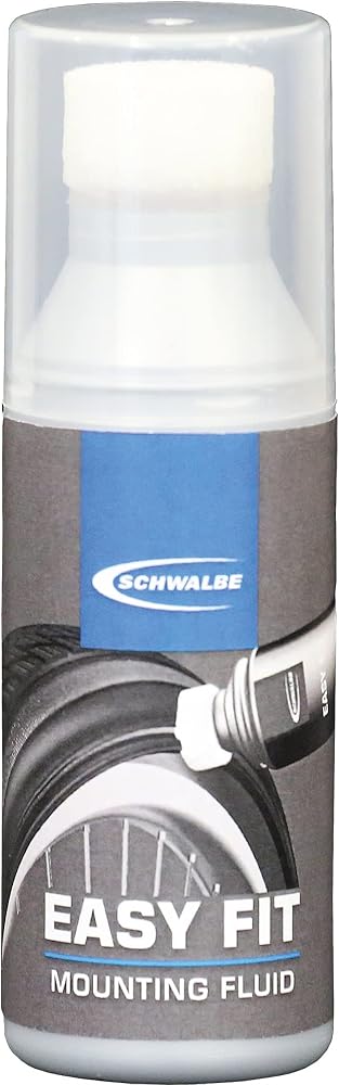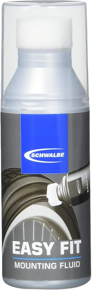 Schwalbe Easy Fit tire mounting fluid. Special assembly liquid for bicycle tires. A practical sponge applicator allows the liquid to be applied to the tire bead very simply. Without smudging fingers. When inflating, the tire bead slides easily into the correct position on the rim. The liquid evaporates completely after about 10 minutes.