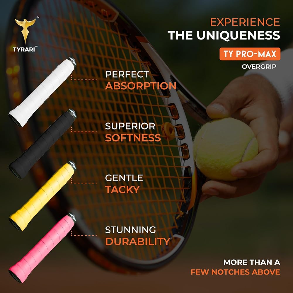 The Tyrari Ty Pro-Max Overgrip is meticulously crafted for intense and enduring play. This overgrip boasts a dry yet gently tacky feel, maintaining a consistent level of tackiness for maximised control and performance. Engineered for high performance, the Pro-Max is ideal for Pro Level players, featuring exceptional sweat absorption that keeps the grip dry, ensuring optimal conditions for power and control during play.
