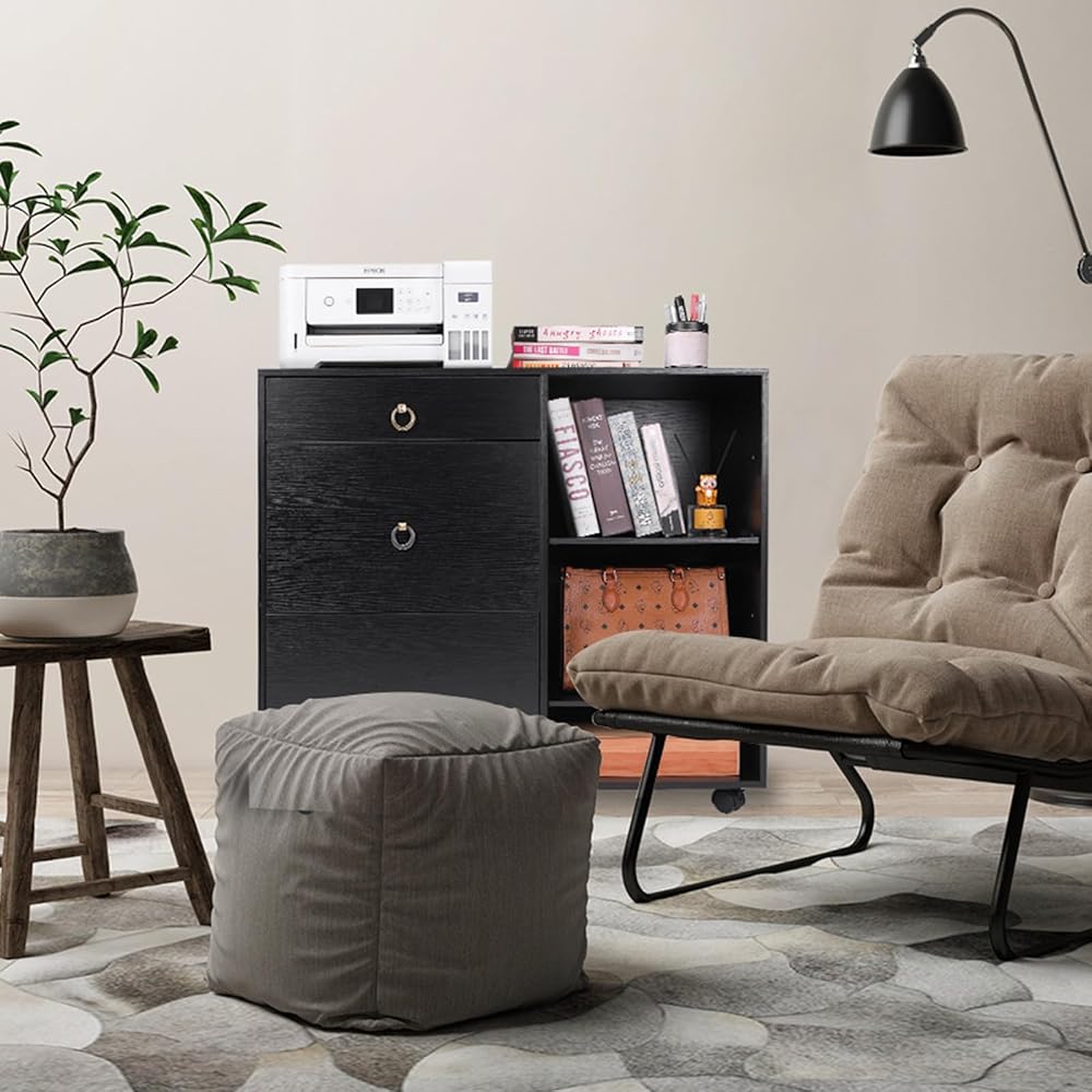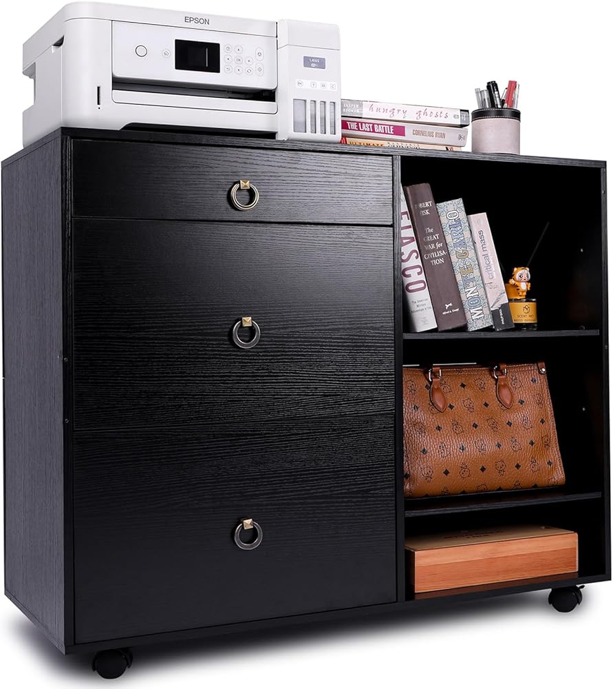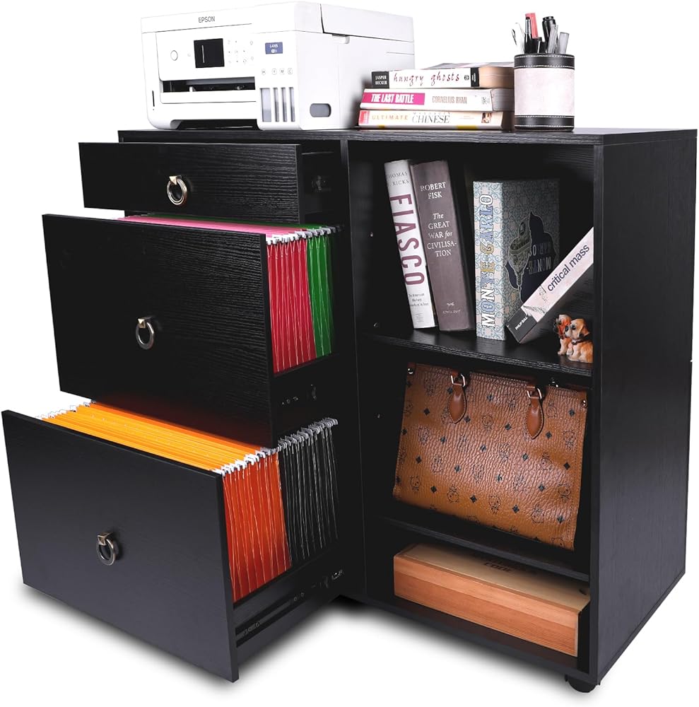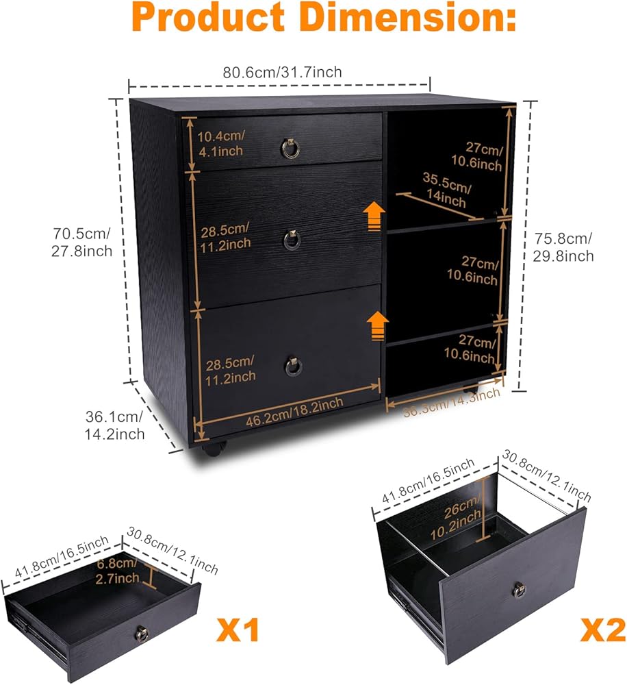 Multiple Storage Options: This filing cabinet with 2 open storage spaces shelf , 2 file drawers to keep the office machines, paper, files and suppliers organized and 1 storage cabinet for letter-size hanging file folders