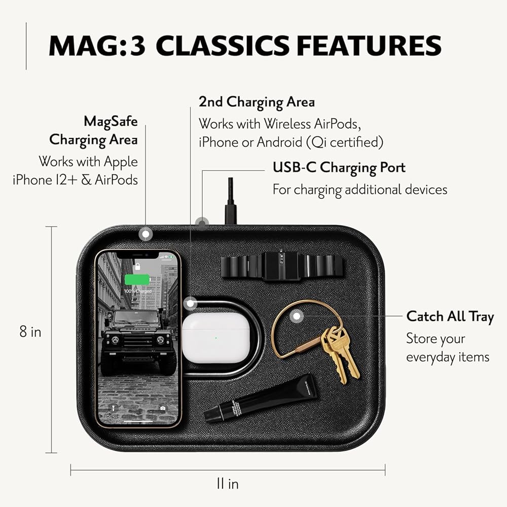 • 3 خيارات للشحن: استمتع بشحن متعدد الأجهزة بدون متاعب دون فوضى السلك. قم بسهولة بتثبيت جهاز MagSafe iPhone الخاص بك على اللوحة المغناطيسية المرتفعة ثم قم بإرساء AirPods بشكل مريح لشحنه بجوار جهاز iPhone الخاص بك على الشاحن اللاسلكي. يتوفر ملحق USB-C متعدد الاستخدامات في الجزء الخلفي من الشاحن لتلبية أي احتياجات شحن إضافية (مثل Apple iWatch).