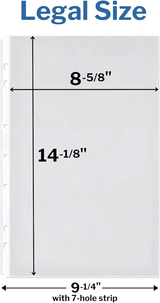 الأبعاد: يبلغ عرض الجيب 8-5/8 بوصة وارتفاعه 14-1/8 بوصة. يتضمن شريطًا مثقوبًا بـ 7 فتحات، وغطاء حماية ورقي مقاس 8.5 × 14 بوصة بعرض 9-1/4 بوصة. بولي قياسي، مثالي لحماية مستندات الاستخدام اليومي.