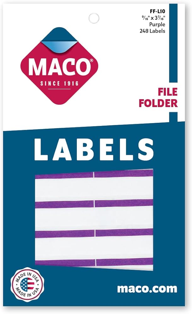 Organize and identify your file folders with MACO Purple File Folder Labels. These labels measure 9/16 x 3-7/16 inches and are self adhesive. They fit 1/3 cut manila file folders and are ideal for school, home or office use. Box contains 248 labels to help create a professional look. MACO has been providing quality products to the business community since 1916. Their office products truly offer a blank canvas for creative business solutions.