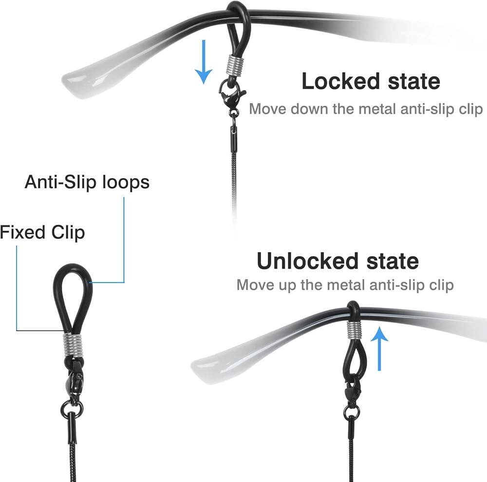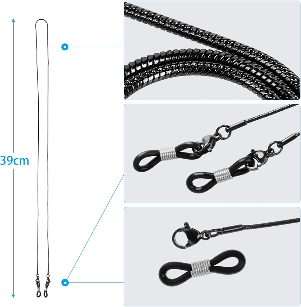 حجم مثالي لسلسلة النظارات 78.74 سم مع مشبك معدني فاخر وحلقات مرنة لربط نظارتك. تتناسب بشكل مريح حول رقبتك.