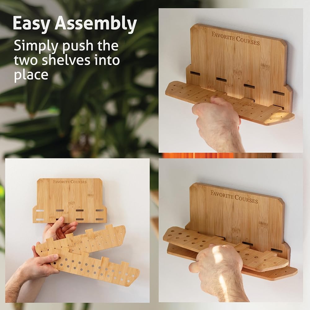 تجميع بسيط: مصنوع من الخيزران، يتكون حامل عرض الجولف الخاص بنا من ثلاث قطع فقط. يعد إدخال رفين في اللوحة الخلفية أمرًا سهلاً - ما عليك سوى دفعهما إلى مكانهما.