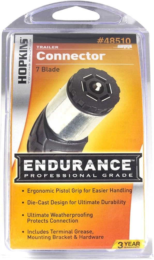 Hopkins Manufacturing Corporation makes your towing experience simpler and more rewarding through innovation and value. As an Endurance product by Hopkins, this product is designed for ultimate durability against harsh weather conditions, corrosion, and normal wear and tear. Hopkins offers a variety of towing solutions including vehicle wiring kits, adapters, vehicle and trailer connectors, breakaway systems, and much more. Today, more than 40 percentage of retail category sales are generated from Hopkins innovations. The Endurance Die-Cast 7 RV Blade Trailer End Plug is designed to connect to large trailers and built to last with ultimate durability. Its convenient pistol grip conscruction for maximum weatherproofing makes it easy to handle. A mounting bracket is provided to keep it safe when not in use.