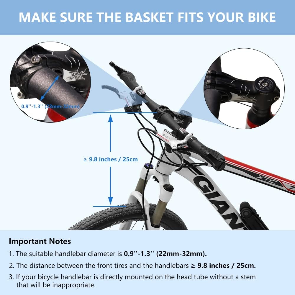 [أبعاد المنتج] 13.4 بوصة طول × 8.7 بوصة عرض × 9.4 بوصة ارتفاع. الحد الأقصى للحمل: 11 رطلاً. يرجى القياس والتأكد من أن المسافة بين الإطار الأمامي والمقود أكثر من 9.8 بوصة/25 سم، وأن قطر المقود يتراوح بين 0.9 بوصة - 1.3 بوصة (22 مم - 32 مم). إذا لم تكن متأكدًا مما إذا كانت السلة تناسب الدراجة، فيرجى الاتصال بنا. ونحن سوف تساعدك بإخلاص.