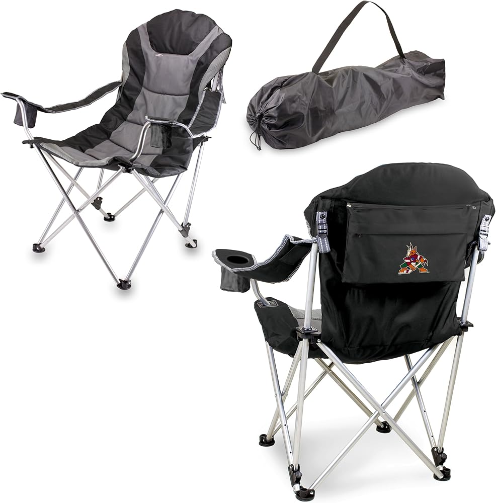 Plush, portable, and packable, the Picnic Time Reclining Camp Chair is your camping cockpit with three reclining positions, an extra-wide, padded polyester seat and armrests, an insulated drink holder, a zippered pocket, and a sturdy steel frame that folds inward to fit in a drawstring carrying bag with carrying strap. This folding outdoor portable chair is the perfect place to post up for camping, picnicking, tailgating, or at the beach.