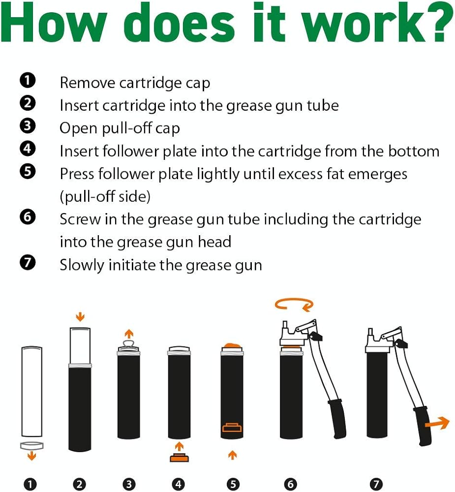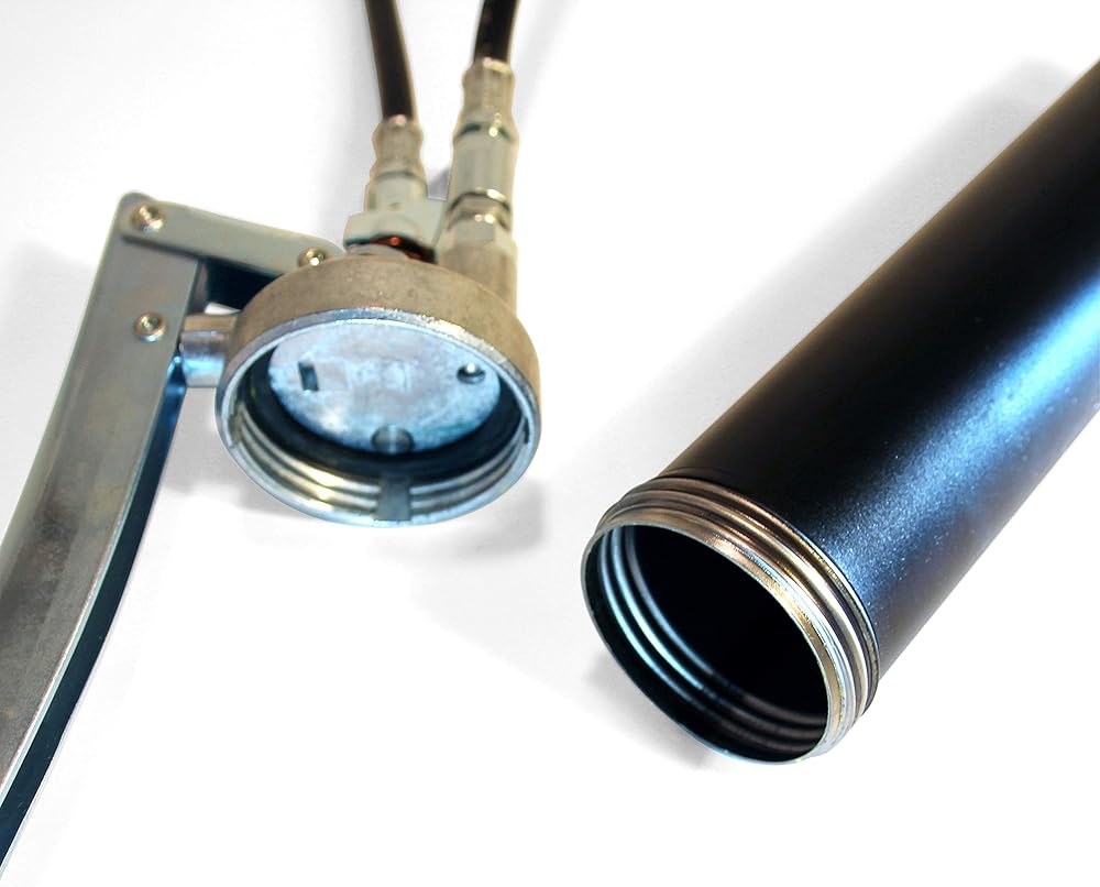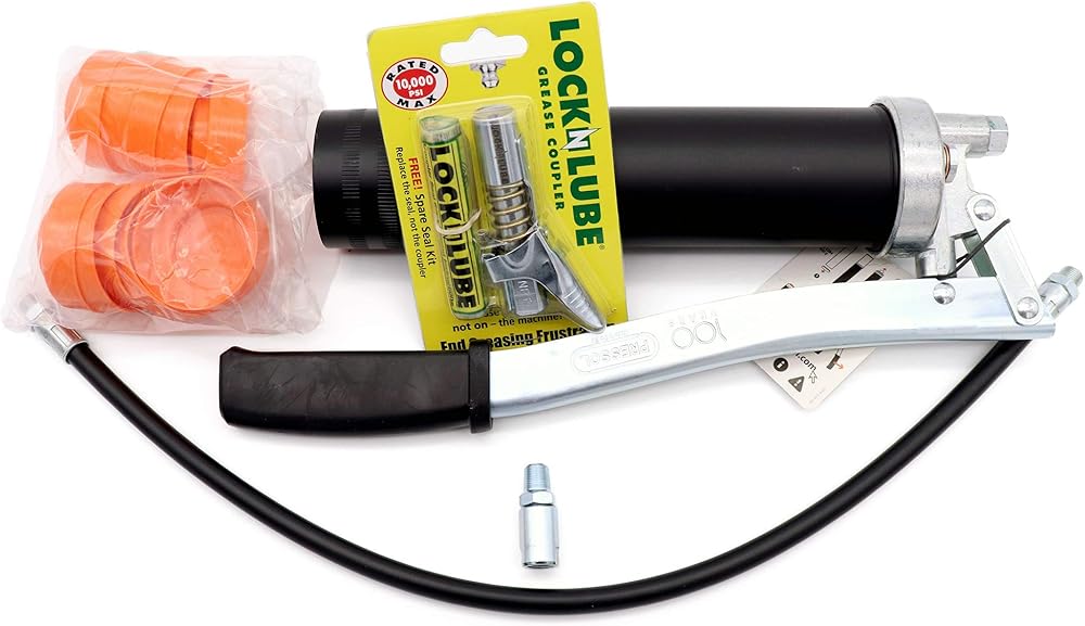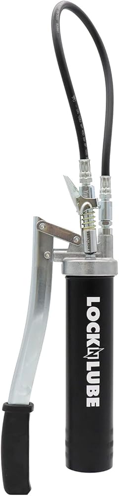 مسدس الشحوم من LockNLube Easy-Prime. تشتمل على قارنة توصيل الشحوم الحاصلة على براءة اختراع (يتم قفلها وتبقى ثابتة ولن تتسرب!) بالإضافة إلى خرطوم مقاس 20 بوصة وخرطوم دوار في الخط.