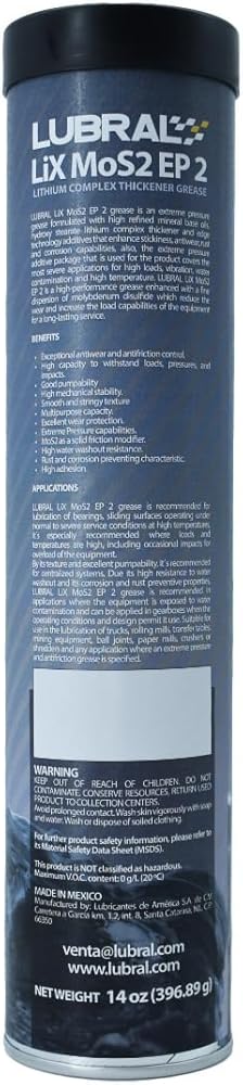 شحم LiX MoS2 EP 2 | زيت تشحيم عالي الأداء بالضغط الشديد | تعزيز القدرة على الالتصاق ومكافحة التآكل | حماية لا مثيل لها ضد التآكل والصدأ والتآكل | 14 أوقية.
