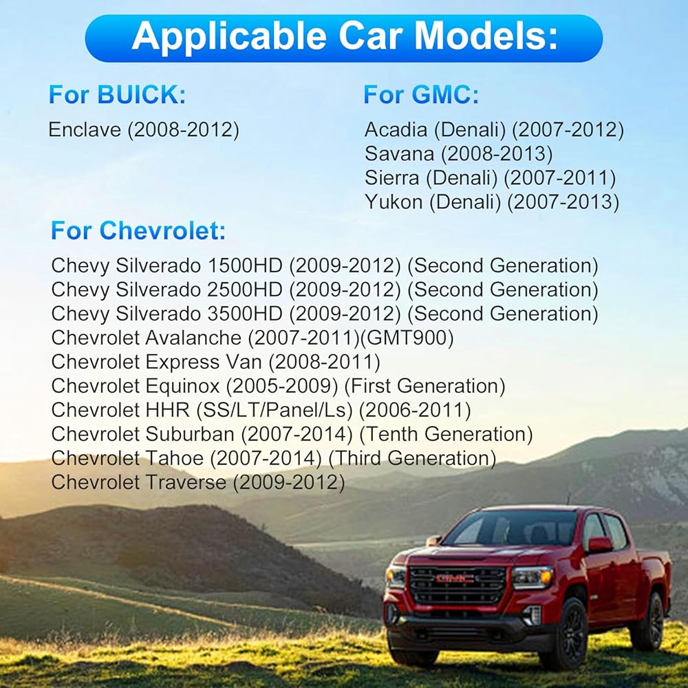 🚗【Applicable Car Models 】Suitable For Chevy Silverado 1500HD 2500HD 3500HD (2007-2014) (Second Generation); For Chevy Tahoe (2007-2014) (Second Generation); For Chevy Equinox (2005-2009) (First Generation); For Chevy Suburban (2007-2014) (Tenth Generation); For Chevrolet Avalanche (2007-2011); For Chevrolet Express Van ( 2008-2011); For Chevrolet Impala (2006-2012); For Buick Enclave (2008-2012). For GMC Sierra (2007-2011); For GMC Savana (2008-2013), Yukon (2007-2013) and Acadia (2007-2012);