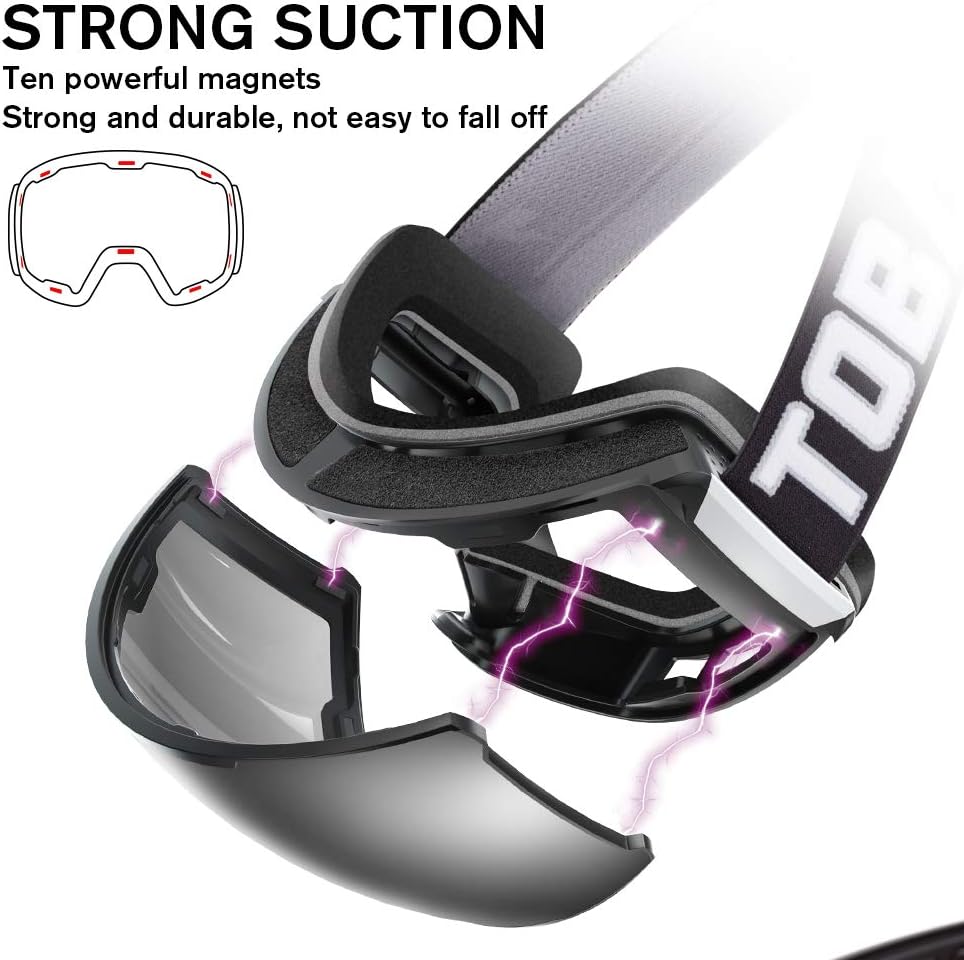• Safe & Durable -- Toba ski google adopt 10 rare earth N50 magnets has stronger suction, Unlike most magnetic goggles use the N45 and 35 magnets on the market, it is more strong and durable, not easy to fall off. It stays firmly while you are on the slope, and to hold the lens in place in the event of a gnarly crash.