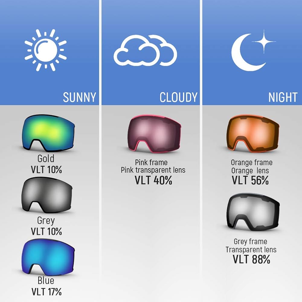 Different colors have different VLT, VLT is suitable for different weather conditions and personal preferences when skiing, snowboarding or other winter sports. Please choose according to what you need.