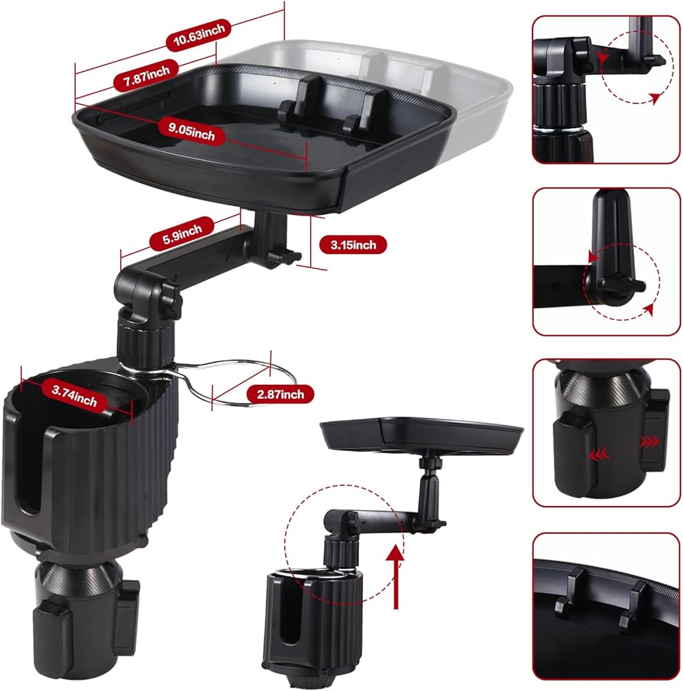 🚗【دوران 360 درجة أكثر ملاءمة】 يمكن لصينية حامل الأكواب في السيارة ضبط موسع حامل الأكواب في السيارة على الوضع الأكثر ملاءمة وراحة. يمكن تمديد صينية تناول الطعام التلسكوبية القابلة للتعديل للسيارة من 6-7 بوصات في الطول إلى 8.3 بوصة في العرض. يحتوي سطح المكتب المؤقت للسيارة على مساحة كافية، كما أن حامل الهاتف حامل الأكواب هو حامل هاتف على سطح المكتب لمشاهدة البرامج أثناء الوجبات.