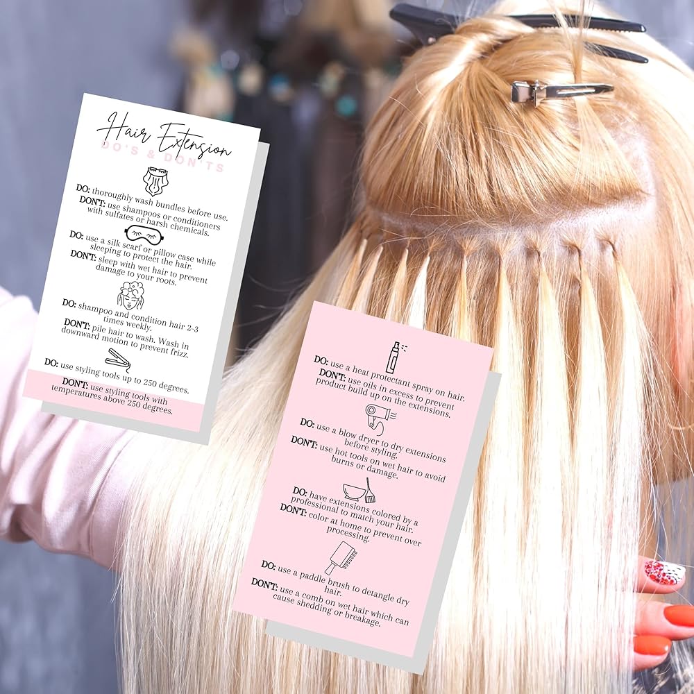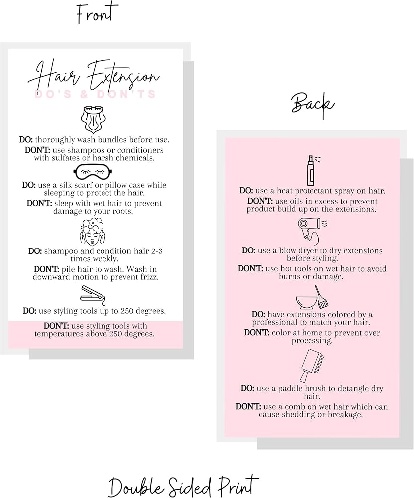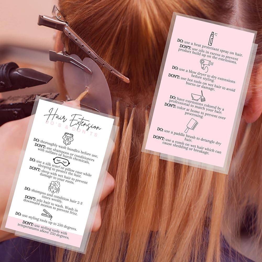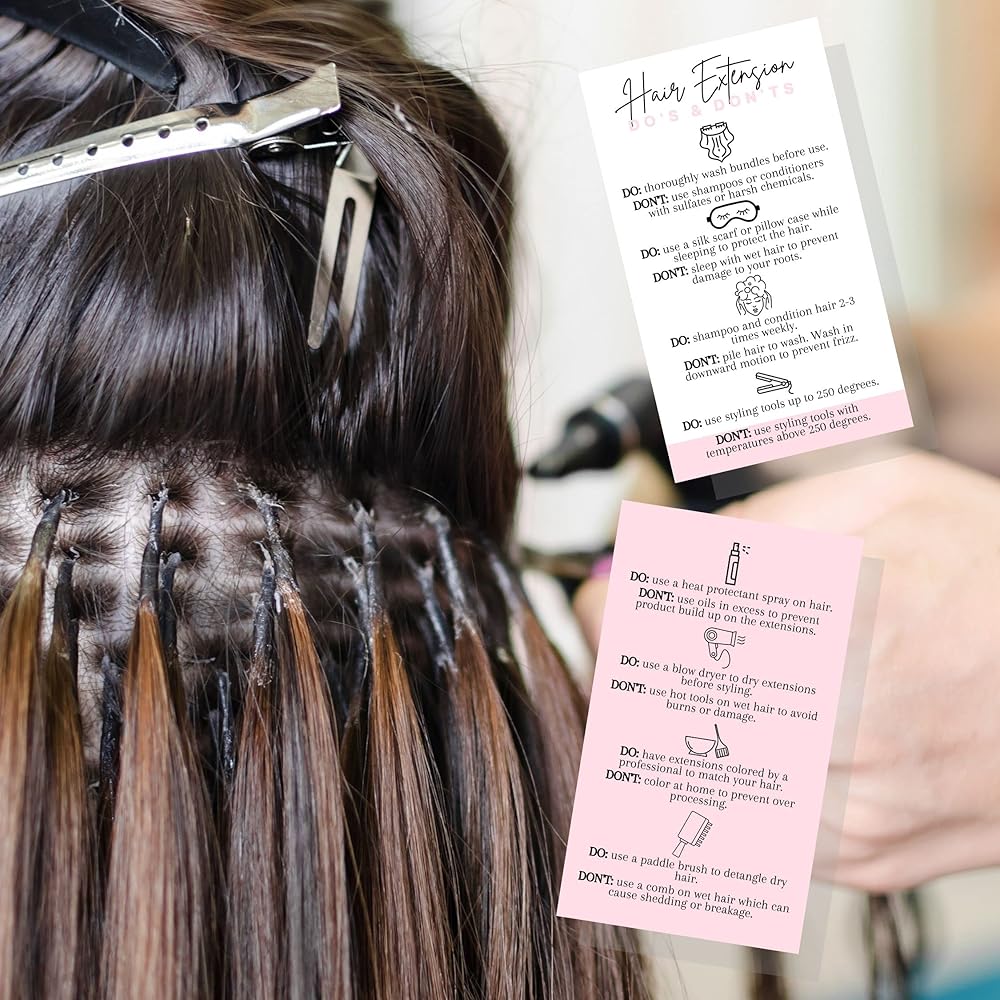 بطاقة ما يجب فعله وما لا يجب فعله بشأن وصلات الشعر | حجم بطاقة العمل المطبوعة فعليًا مقاس 2 × 3.5 بوصة | لوازم التجميل | تصميم البطاقة باللونين الأبيض والوردي