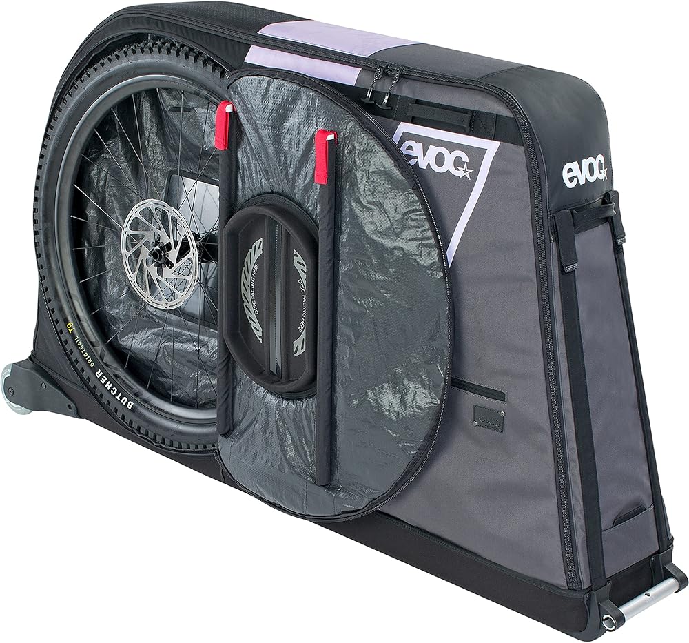 EVOC BIKE BAG PRO lightweight bike transport bag (incl. CLIP-ON WHEEL 2.0, DISC PROTECTION, FORK MOUNT stabilisation, BIKE STAND PRO, FRAME PAD, 305l, max. wheelbase 130 cm), Black | Description: The EVOC BIKE BAG PRO is a lightweight yet sturdy bike travel bag and is suitable for transporting many bikes. It offers enough storage space for cross country, all mountain, enduro, freeride, downhill, road, gravel, triathlon bikes and bikes for up to 29°. The extra-wide chassis and numerous grip options make it ideal for transporting in the car, on plane journeys or on the train. The bag includes the practical BIKE STAND PRO and a protective FRAME PAD. If necessary, the wheels can be exchanged at any time. Particularly noteworthy is the extra-wide chassis, the clip-on wheels and handle options of the bag, which make it the perfect bike bag. In addition, the wheels can be stowed separately and protected by DISC PROTECTION. | Features: - separate compartment for the wheels - DISC PROTECTION - reinforced fork holder - exchangeable CLIP ON WHEELS - BIKE STAND PRO - FRAME PAD | Details: - Outer dimensions: 147 x 85 x 37 cm - Inner dimensions: 136 x 80 x 27 cm - Foldable: 147 x 25 x 37 cm - Volume: 305 l - Weight: 9600 g (total) - Max. wheelbase: 130 cm - Colour: Black | Material: - P 600D | Manufacturer: We still test all our products ourselves and work every day to make them just that little bit better. Our DNA is in every product and with everything we make we try to convey our passion for sport and travel. EVOC products are therefore always a little bit more than just pieces of equipment. EVOC stands for evolution and the concept for high-quality, sporty backpacks, bags and luggage with a special focus on uncompromising protection of people and material. Protect the things you love! Or shorter: EVOC - PROTECTIVE SPORTS PACKS