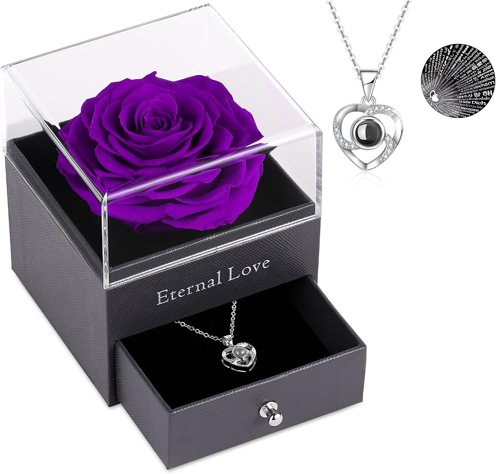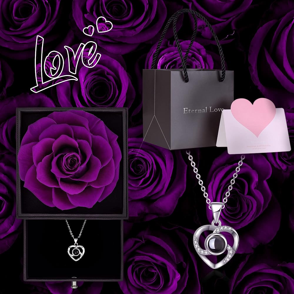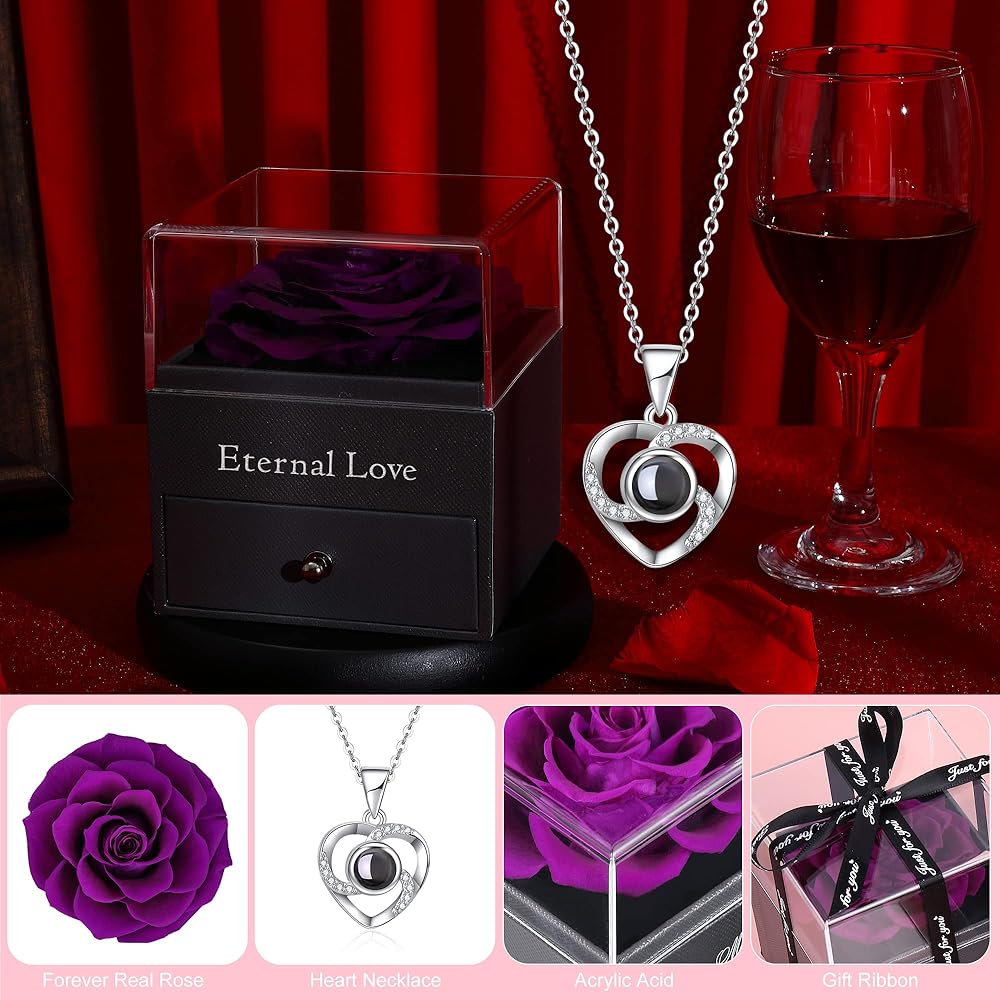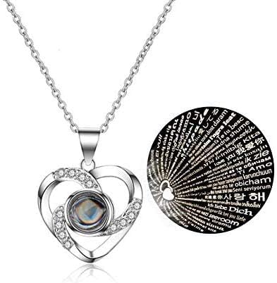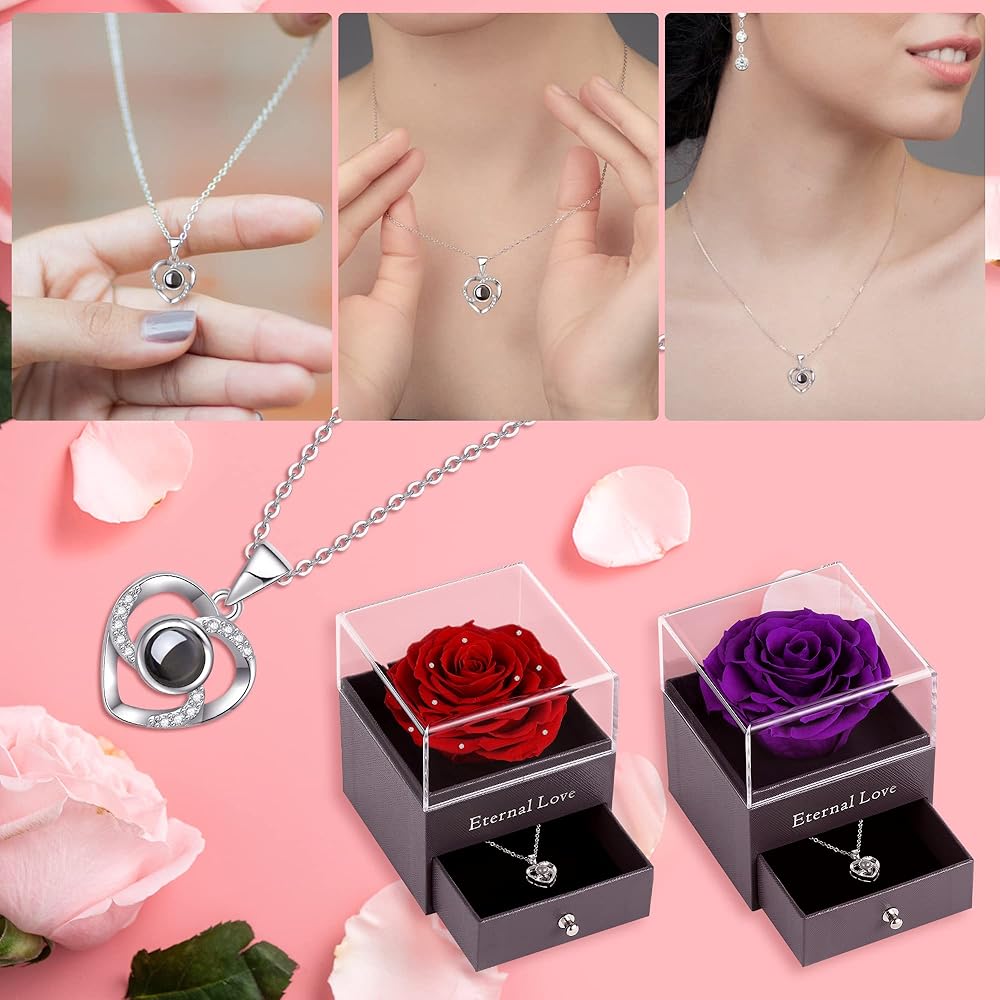 تصميم هدايا خاصة: وردة خضراء فاتحة محفوظة مع قلادة فضية اللون على شكل قلب متطابقة مع 100 لغة: كيفية رؤية اللغة: ضع المركز المحدب للقلادة بالقرب من عينيك وبعد ذلك سترى "أنا أحبك" "في 100 لغة