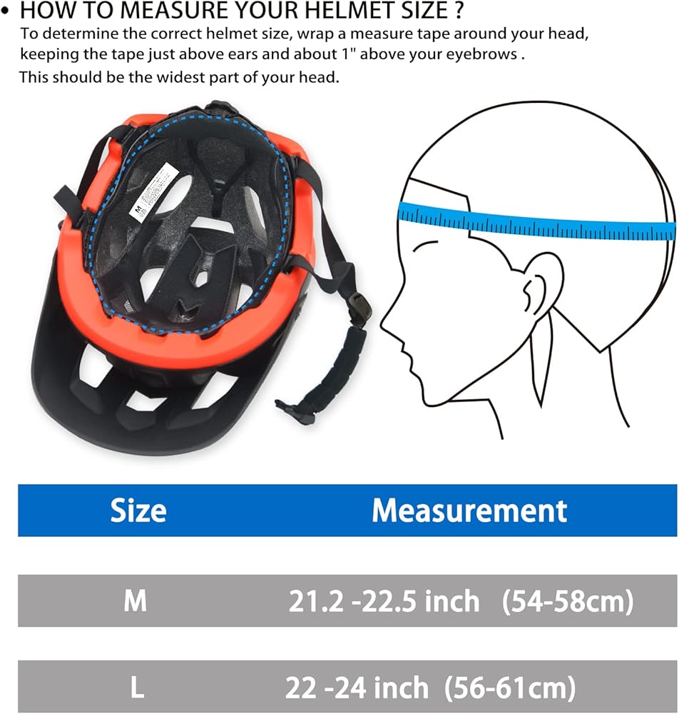خوذة دراجة ملائمة تمامًا: مقاس M: 21.2-22.5 بوصة (54-58 سم) مقاس L: 22-24 بوصة (56-61 سم) مناسبة للرجال والنساء، قرص قابل للتعديل بحجم مناسب يزيد من ملاءمة الرأس، سهل ضبط حجم خوذة الدراجة بيد واحدة، تجنب سحب الشعر