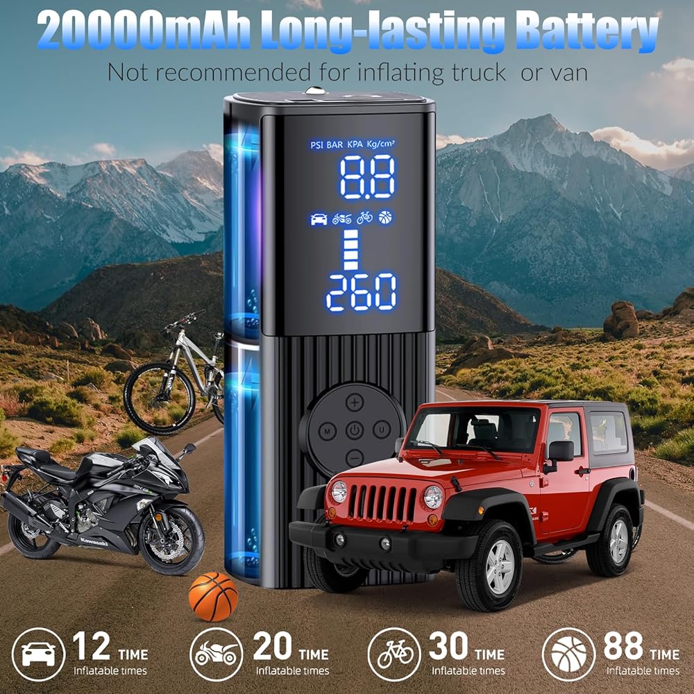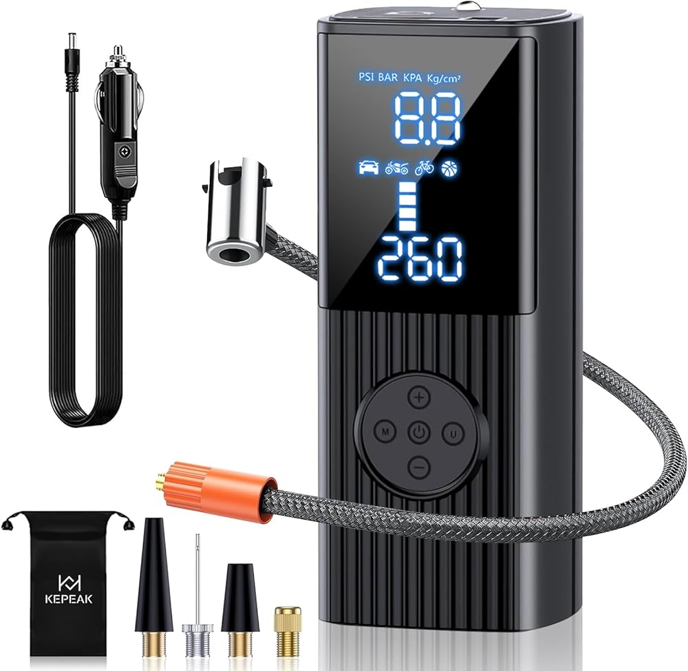 منفاخ إطارات KEPEAK ضاغط هواء محمول - مضخة هواء 20000 مللي أمبير في الساعة لإطارات السيارات، مضخة إطارات لاسلكية 150 رطل لكل بوصة مربعة مع شاشة LCD مزدوجة، ضوء LED للسيارة والدراجة والدراجة النارية والكرة