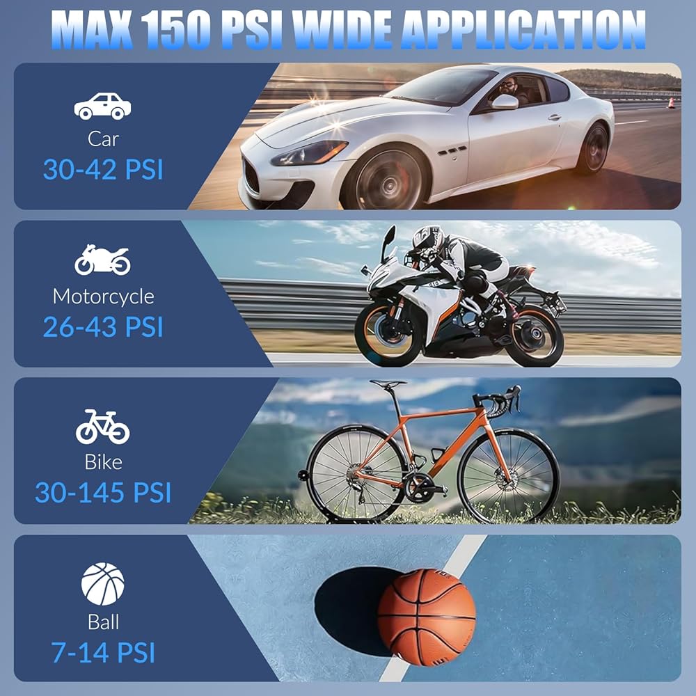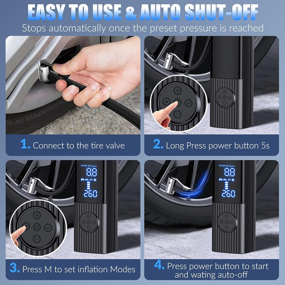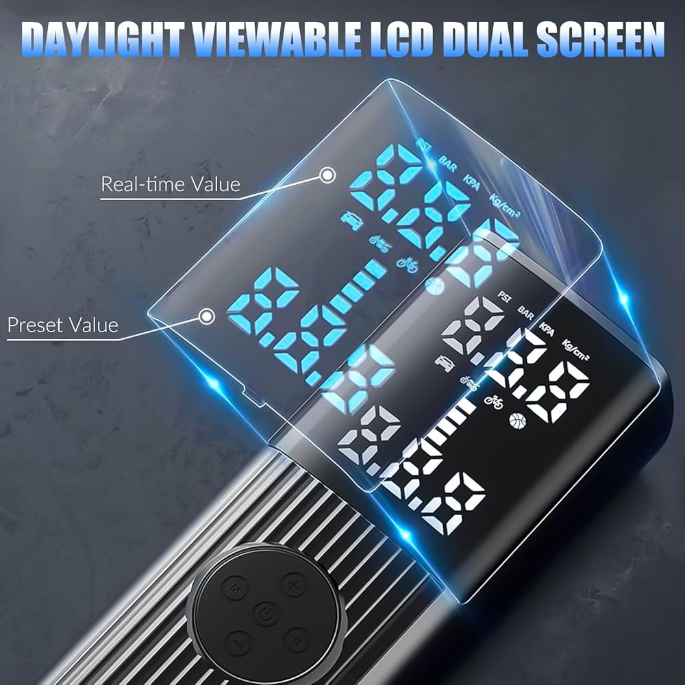 • 🚗 [شاشة LCD، ميزة الإيقاف التلقائي] تم تجهيز مضخة الهواء المحمولة لإطارات السيارة بشاشة LCD مزدوجة لمراقبة ضغط الإطارات بدقة في الوقت الحقيقي وعرض القيمة المحددة مسبقًا. مع دقة قياس تبلغ ±2 رطل لكل بوصة مربعة، يمكنك نفخ إطاراتك بأمان. سيتم إيقاف تشغيل مضخة الهواء المحمولة لإطارات السيارة تلقائيًا بمجرد الوصول إلى الضغط المطلوب لمنع النفخ الزائد.