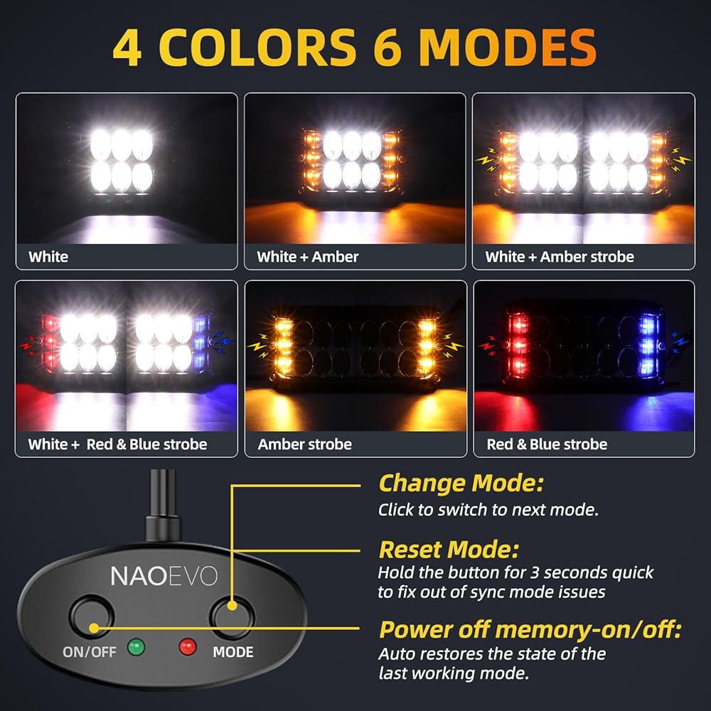 NAOEVO 4 بوصة ستروب LED ضوء القرون، العنبر الأبيض الأزرق الأحمر الجانب مطلق النار، 6 أوضاع 60W ضوء الطريق على الطرق الوعرة مع وظيفة الذاكرة، الضباب في حالات الطوارئ القيادة ضوء العمل لشاحنة قارب جيب سيارات الدفع الرباعي مع تسخير الأسلاك