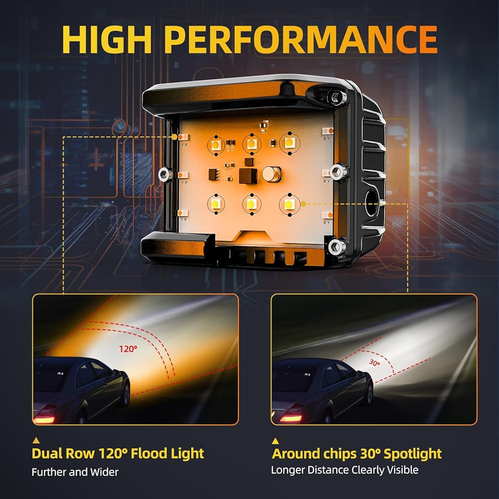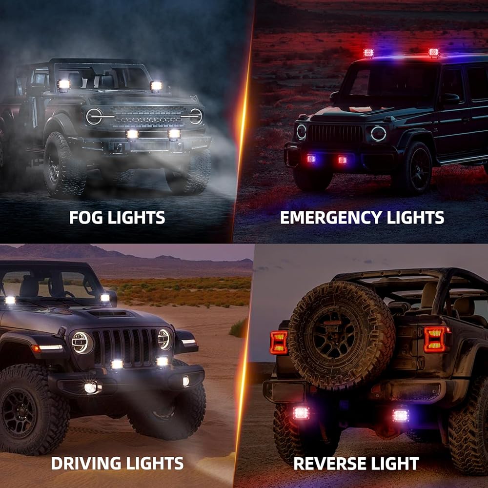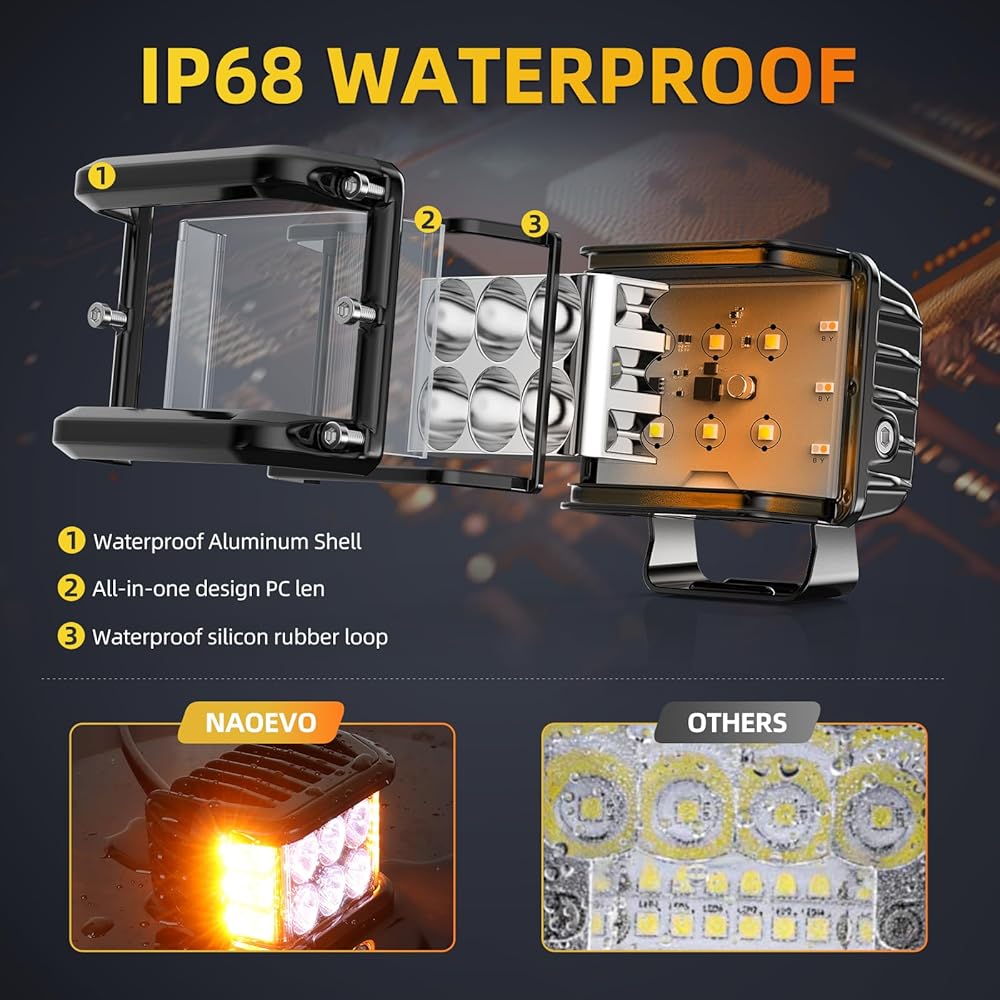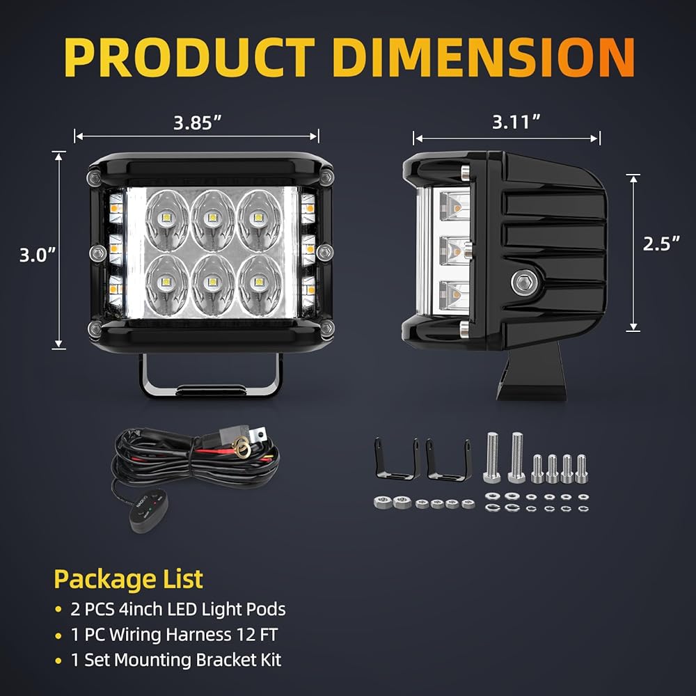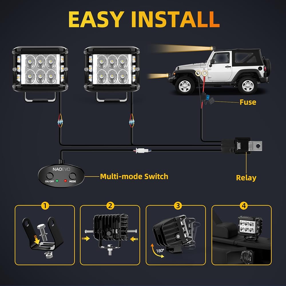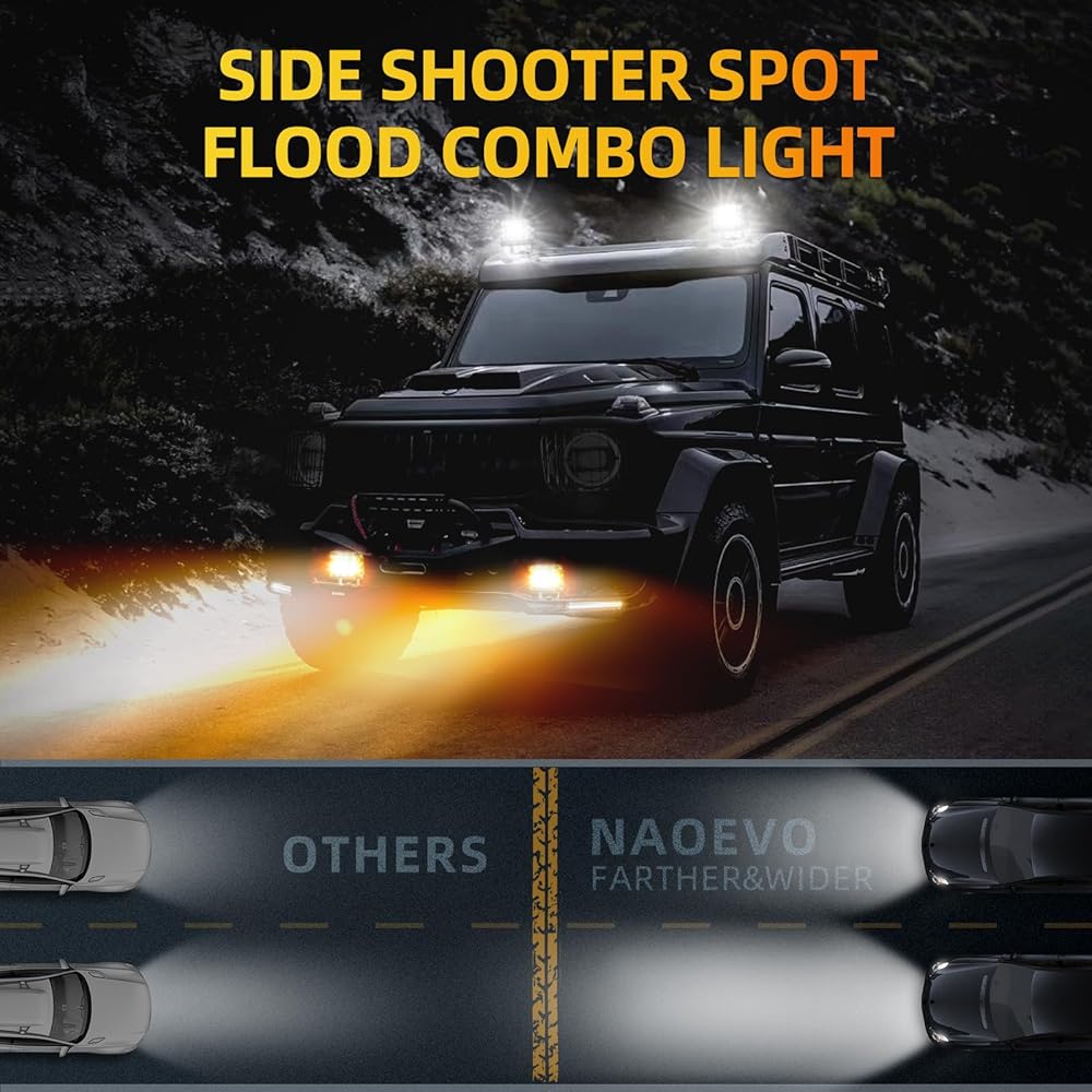 【ترقية 4 ألوان مع 6 أوضاع】 - قم بتنظيم الوضع بدوره عن طريق مفتاح الأضواء. تأتي مصابيح LED NAOEVO مقاس 4 بوصات مع وظيفة أضواء النهار (أضواء كاشفة بيضاء باردة ساطعة)، ووظيفة إضاءة جانبية صلبة (شعاع فيضان جانبي باللون الأزرق والأحمر والعنبر)