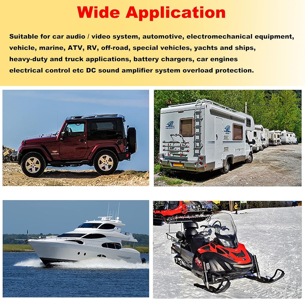 Wide Application. Suitable for car audio / video system, automotive, electromechanical equipment, vehicle, marine, ATV, RV, off-road, special vehicles, yachts and ships, heavy-duty and truck applications, battery chargers, car engines electrical control etc DC sound amplifier system overload protection.