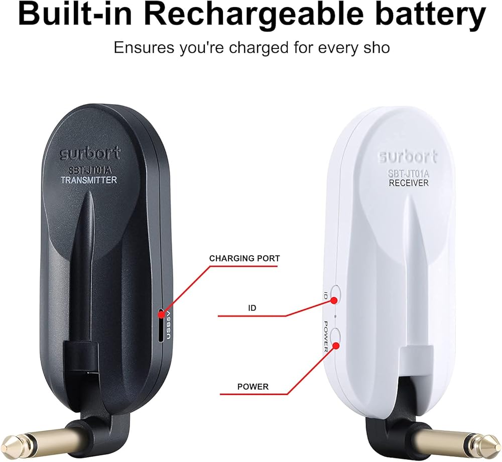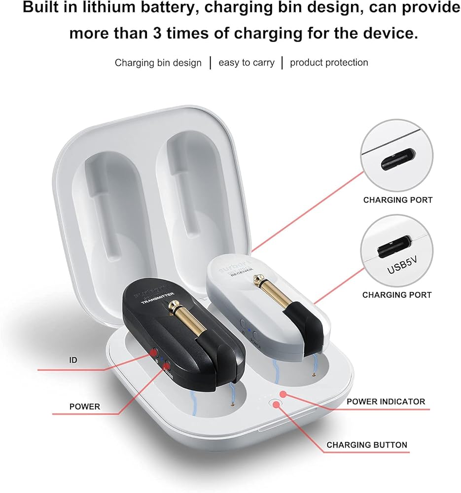 🎸 نظام جيتار لاسلكي مع حجرة شحن: تحتوي حجرة الشحن على بطارية ليثيوم مدمجة قابلة لإعادة الشحن بقدرة 3000 مللي أمبير في الساعة، و450 مللي أمبير لكل من جهاز الإرسال والاستقبال. مع وقت عمل يصل إلى 6 ساعات عند شحنها بالكامل، وكابل من النوع c لسهولة الشحن لضمان الأداء الجيد الخاص بك في كل حفلة.