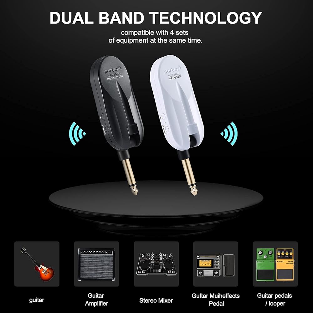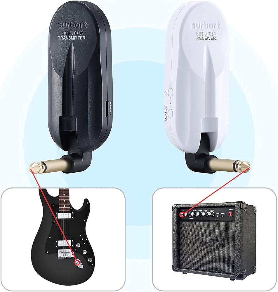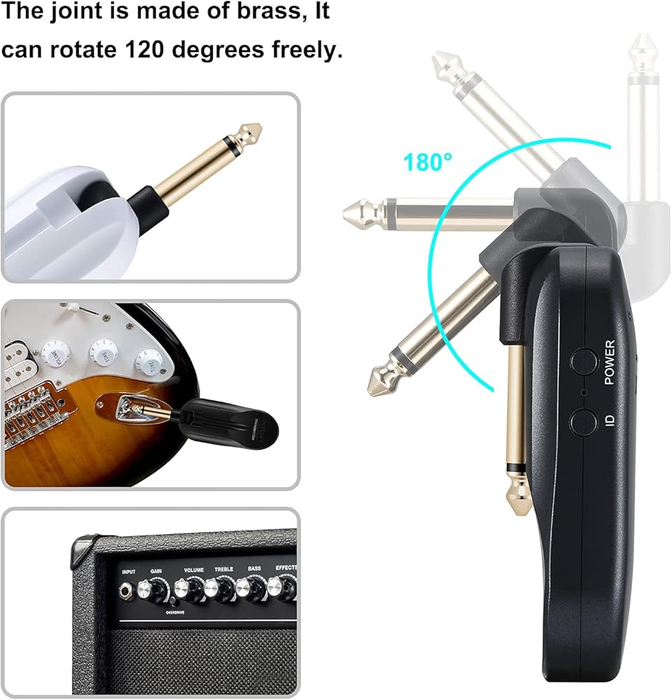 🎸 نقل إشارة لاسلكية غير مضغوطة 5.1 جيجا/5.8 جيجا، ضوضاء منخفضة ووقت استجابة، النطاق الفعال لنظام الجيتار اللاسلكي حوالي 35-50 مترًا. يأتي كل من جهاز الإرسال والاستقبال مع موصلات 6.35 مم يمكن تدويرها في نطاق 120 درجة.