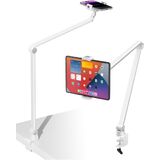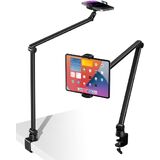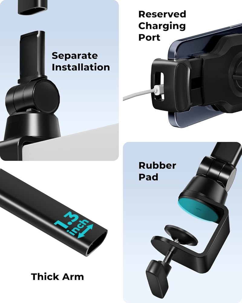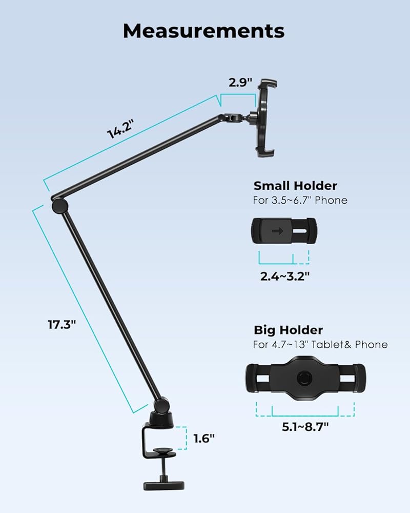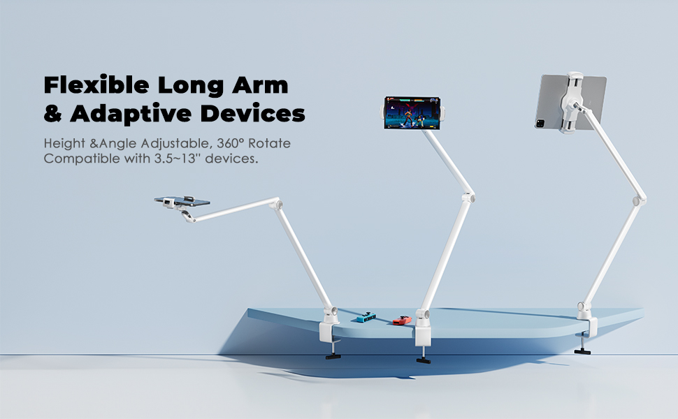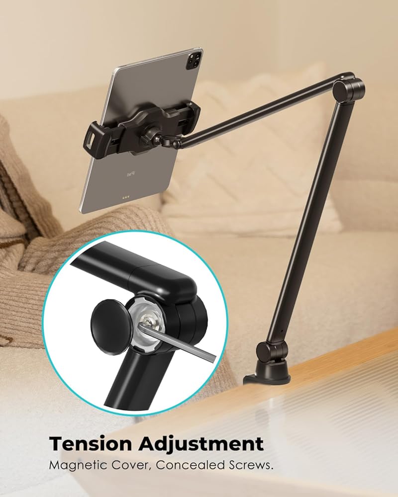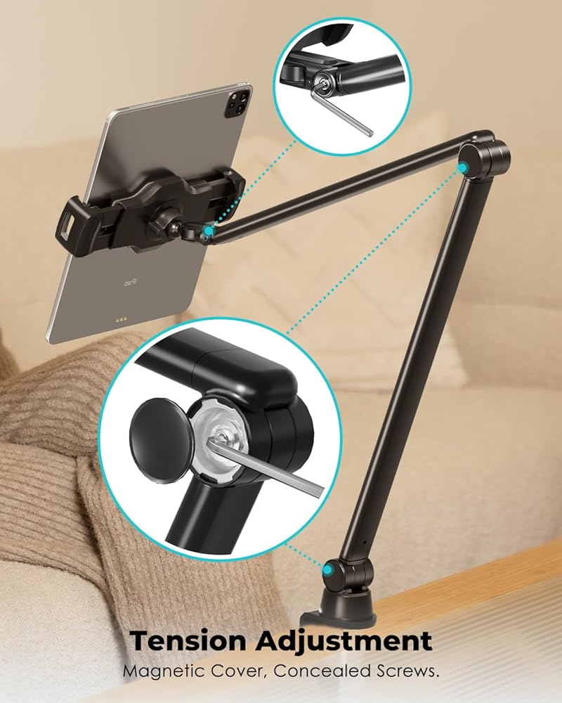 【ذراع طويل مرن】حامل كمبيوتر لوحي معدني مصنوع من سبائك الألومنيوم عالية الجودة، ويتميز بذراع بعرض 1.29 بوصة/3.3 سم لدعم ثابت لجهازك. اضغط على الغطاء المغناطيسي الفضي عند المفصل لإزالته، واستخدم مفتاح ربط ل اضبط الشد لدعم الأجهزة الأثقل. الذراعان الممتدان طويلان بشكل استثنائي، بقياس 17 بوصة/44 سم و14 بوصة/36 سم، لتلبية الاحتياجات المختلفة. يمكنك تثبيت الحامل على جانب أو خلف الطاولة، والطول الكافي تتيح لك الأذرع ضبط الجهاز على أي موضع.
