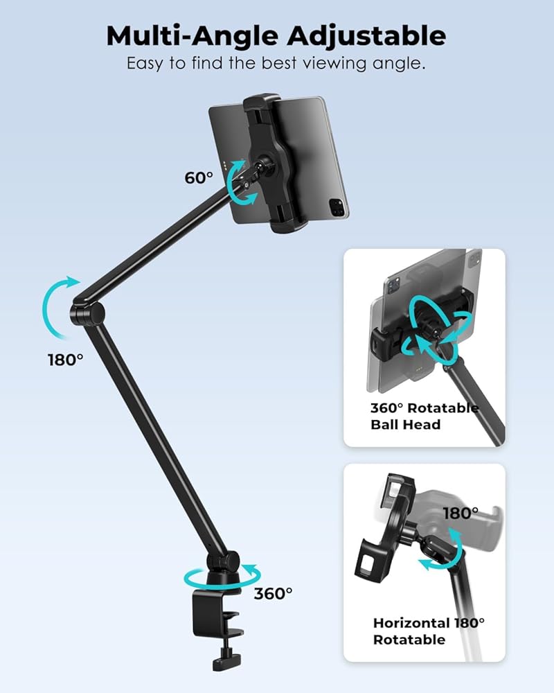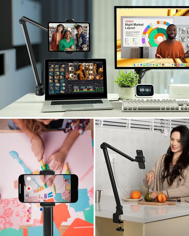【تركيب علوي بدون استخدام اليدين】حامل الكمبيوتر اللوحي المرن هو الرفيق المثالي لجهازك اللوحي والهاتف، ويتكيف مع سيناريوهات مختلفة. وهو يدعم جهاز iPad أو iPhone الخاص بك لأنشطة مثل مشاهدة الأفلام وممارسة الألعاب والقراءة والتحقق من الوصفات ودليل القراءة والمزيد. يوفر هذا الحل المريح تجربة ممتعة ومريحة.