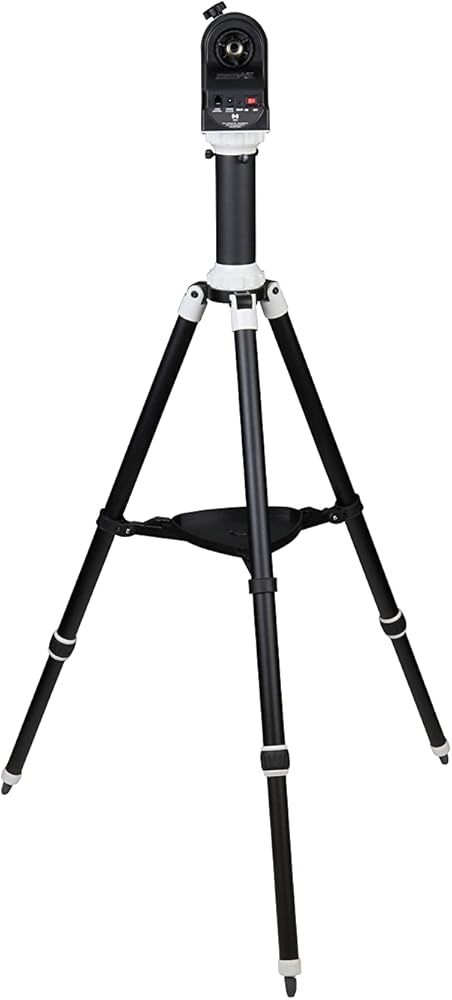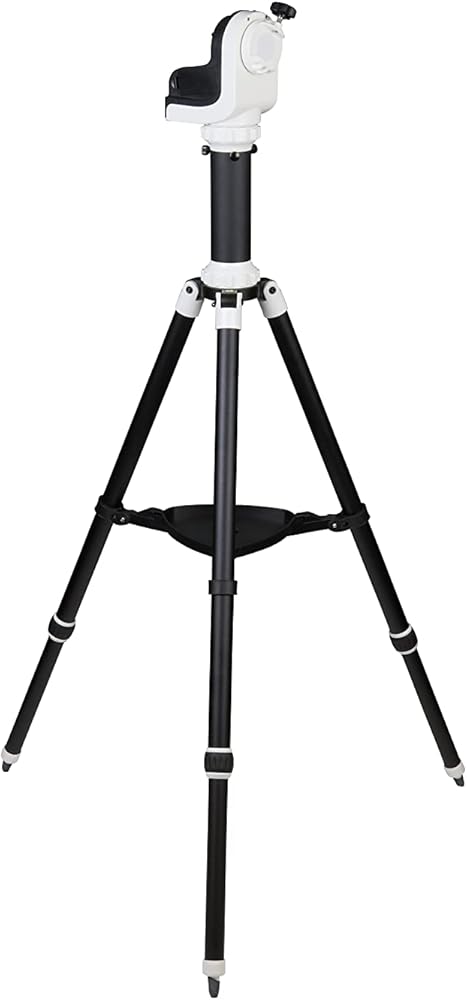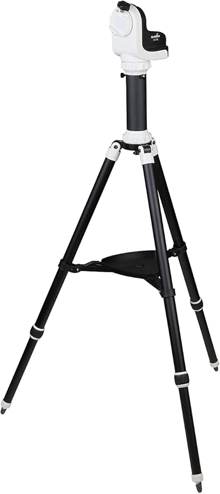 Motorized alt-az mount with 11-pound payload capacity, built-in Wi-Fi, spring-loaded worm gears, and Vixen-style dovetail. SynScan GoTo telescope mount with 42,900+ object database. Sidereal, lunar, and solar tracking speeds. SynScan Pro app for iOS and Android. Adjustable-height aluminum tripod with 1.25-inch diameter legs. DC operation (batteries not included).