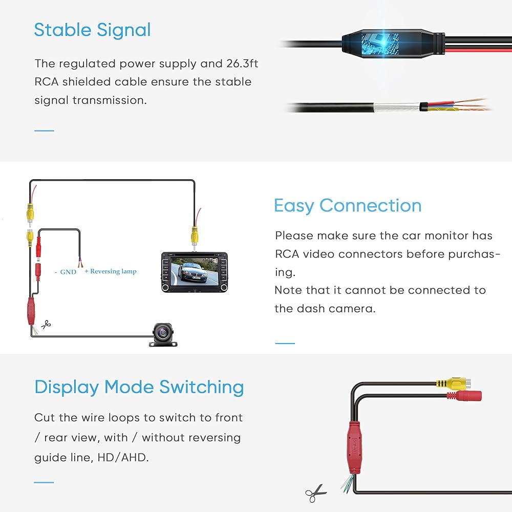 توافق واسع: الكاميرا الخلفية Pixelman PAHD-2P للسيارة مجهزة بموصل RCA، لاحظ أنه لا يمكن توصيلها بكاميرا أجهزة القياس. تستخدم هذه الكاميرا الاحتياطية للوحة الترخيص جهد تيار مستمر 12-24 فولت للاتصال بمنفذ فيديو RCA للشاشة/الشاشة/الراديو/ستيريو. إنها كاميرا احتياطية عالمية، متوافقة مع السيارة، والبيك اب، والشاحنات، وسيارات الدفع الرباعي، وجيب، والشاحنات الصغيرة، والجرار، وسيارات السيدان والمقطورات والتخييم (تعمل هذه الكاميرا الاحتياطية البديلة بشكل جيد مع الراديو أو الشاشة أو مشغل DVD أو الشاشة مع موصل RCA).