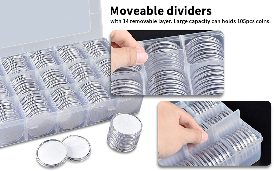 حامل تخزين العملات المعدنية: علبة تجميع العملات المعدنية مصنوعة من بلاستيك قوي وشديد التحمل، وأكثر مقاومة ومقاومة للصدمات من الأكريليك. تصميم شفاف واضح بما فيه الكفاية لعرض العملات المعدنية، كل حجرة تناسب كبسولات العملات المعدنية بشكل مريح وأنيق. حماية 100% للعملات المعدنية الخاصة بك.