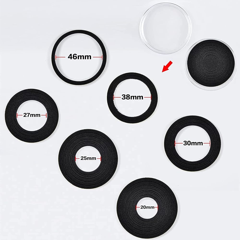 لوازم مجموعة العملات المعدنية مع 6 أحجام من الحشيات الإسفنجية: حامل العملات المعدنية بحجم داخلي 46*3 مم، 6 مقاسات (20/25/27/30/38/46 مم) حشية إسفنجية، يمكن أن تناسب جميع العملات المعدنية المختلفة، حتى العملات المعدنية، عملات التحدي، الكوارت الأمريكية أو الدولارات، يتيح لك التصميم القائم إمكانية وضع الجراب وإخراجه بسهولة.