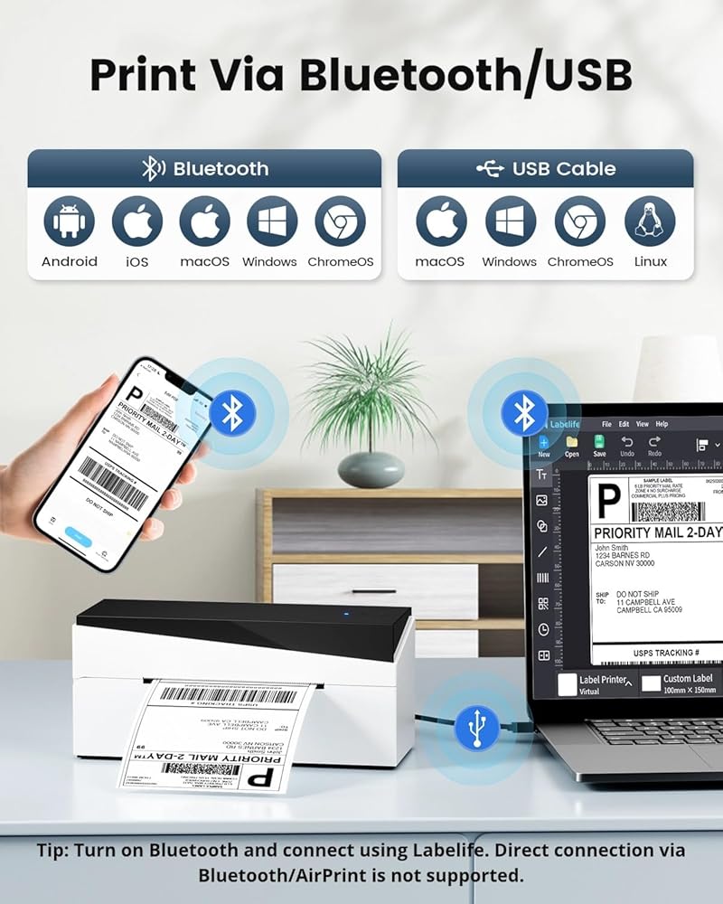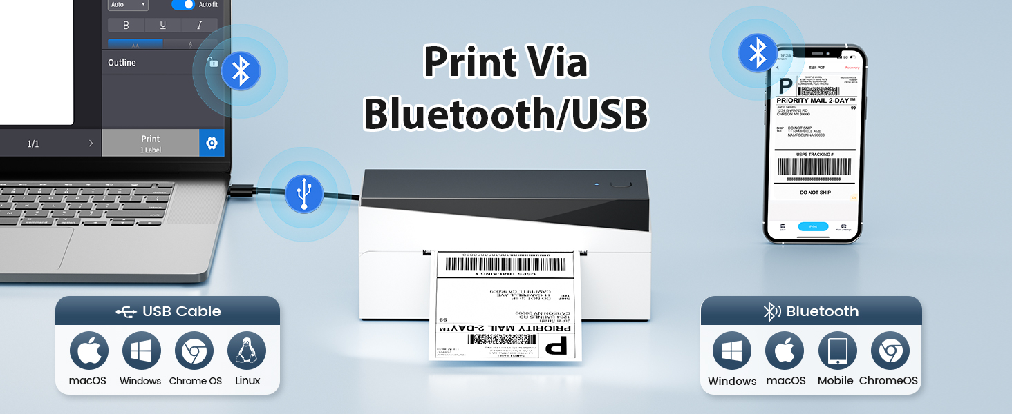 【طابعة ملصقات بلوتوث 】 يمكن توصيل طابعة ملصقات memolife بالهواتف الذكية وأجهزة الكمبيوتر عبر البلوتوث للطباعة. طابعة ملصقات الشحن 249BT متوافقة مع أنظمة التشغيل مثل Windows وmacOS وChrome OS، مما يسمح لك بتوصيل المطبوعات وتحريرها مع الطابعة باستخدام وظيفة Bluetooth.