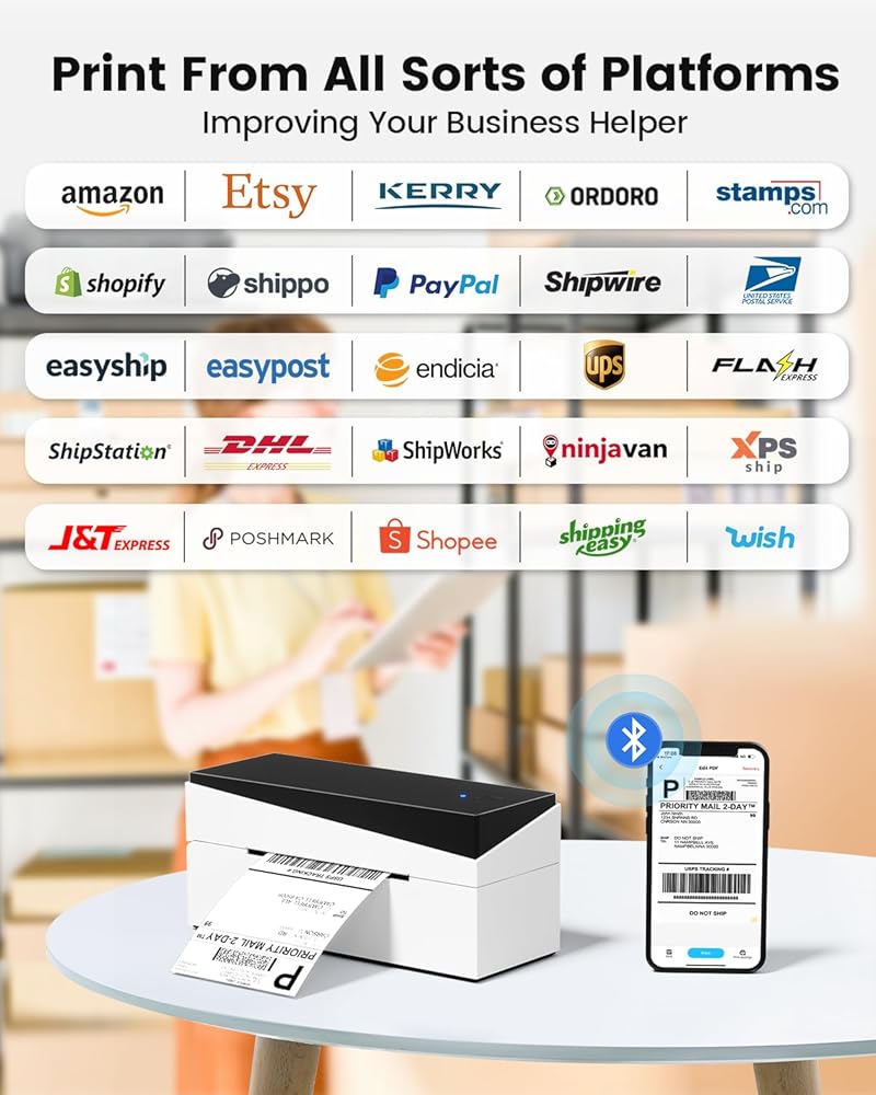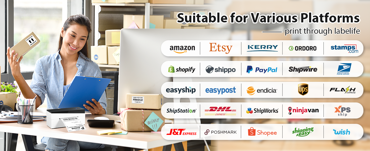 【منصات متوافقة مع طابعة الملصقات 249BT】يمكن لطابعات الملصقات الحرارية إنشاء ملصقات متوافقة مع العديد من منصات التجارة الإلكترونية ومقدمي الخدمات اللوجستية. بغض النظر عن النظام الأساسي الذي تستخدمه، مثل eBay أو Amazon أو Walmart أو Shopify أو USPS أو Etsy أو PayPal أو FedEx، يمكن للطابعة الحرارية 249BT إنتاج ملصقات تلبي المواصفات المطلوبة. إنه بالفعل خيار موثوق لاحتياجات الطباعة الخاصة بك.