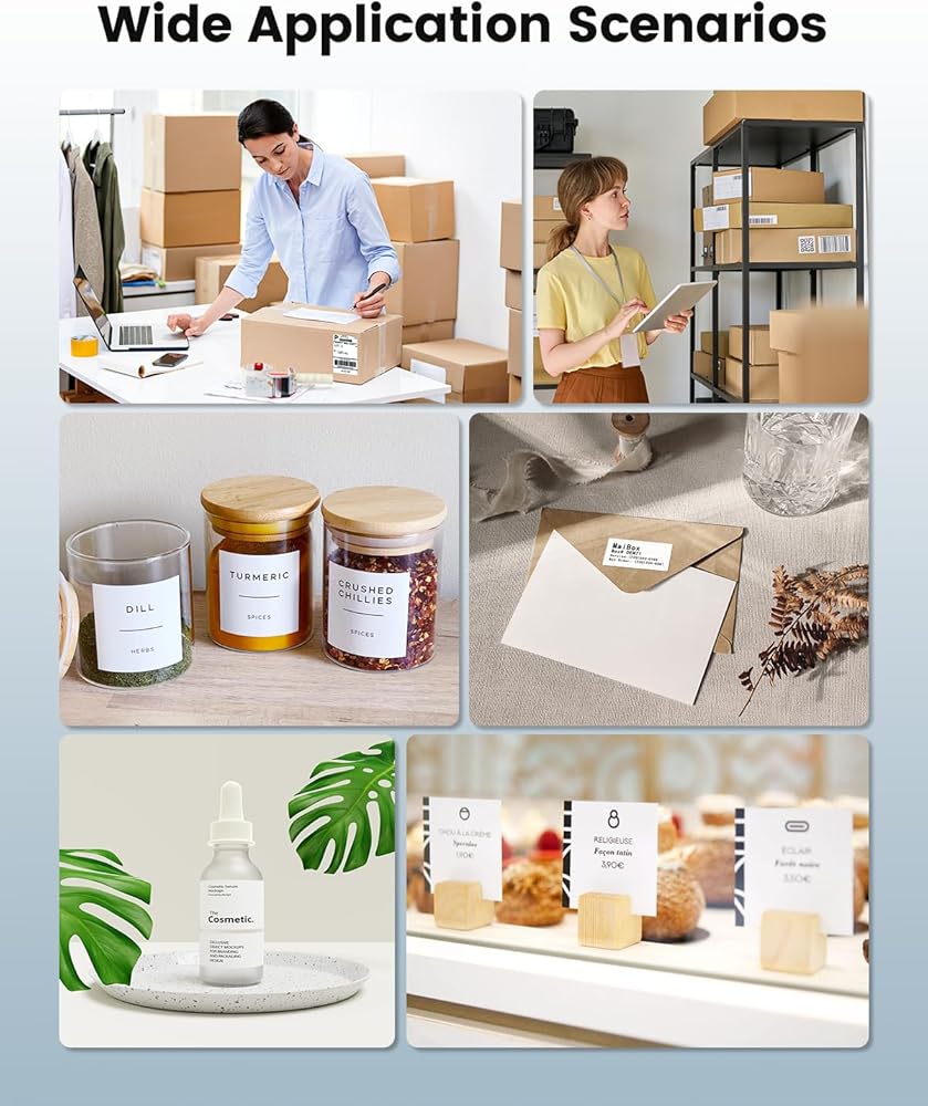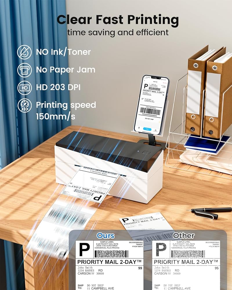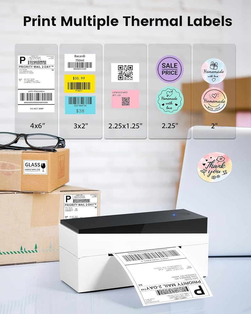【تُطبق على نطاق واسع】طابعة ملصقات الشحن للشركات الصغيرة / بائع EBay / بائع Amazon / البائع عبر الإنترنت / كاتب المكتب والأفراد. تساعدك طابعة الملصقات الحرارية على طباعة ملصقات الشحن والشعار/الشكر/العنوان والمزيد.