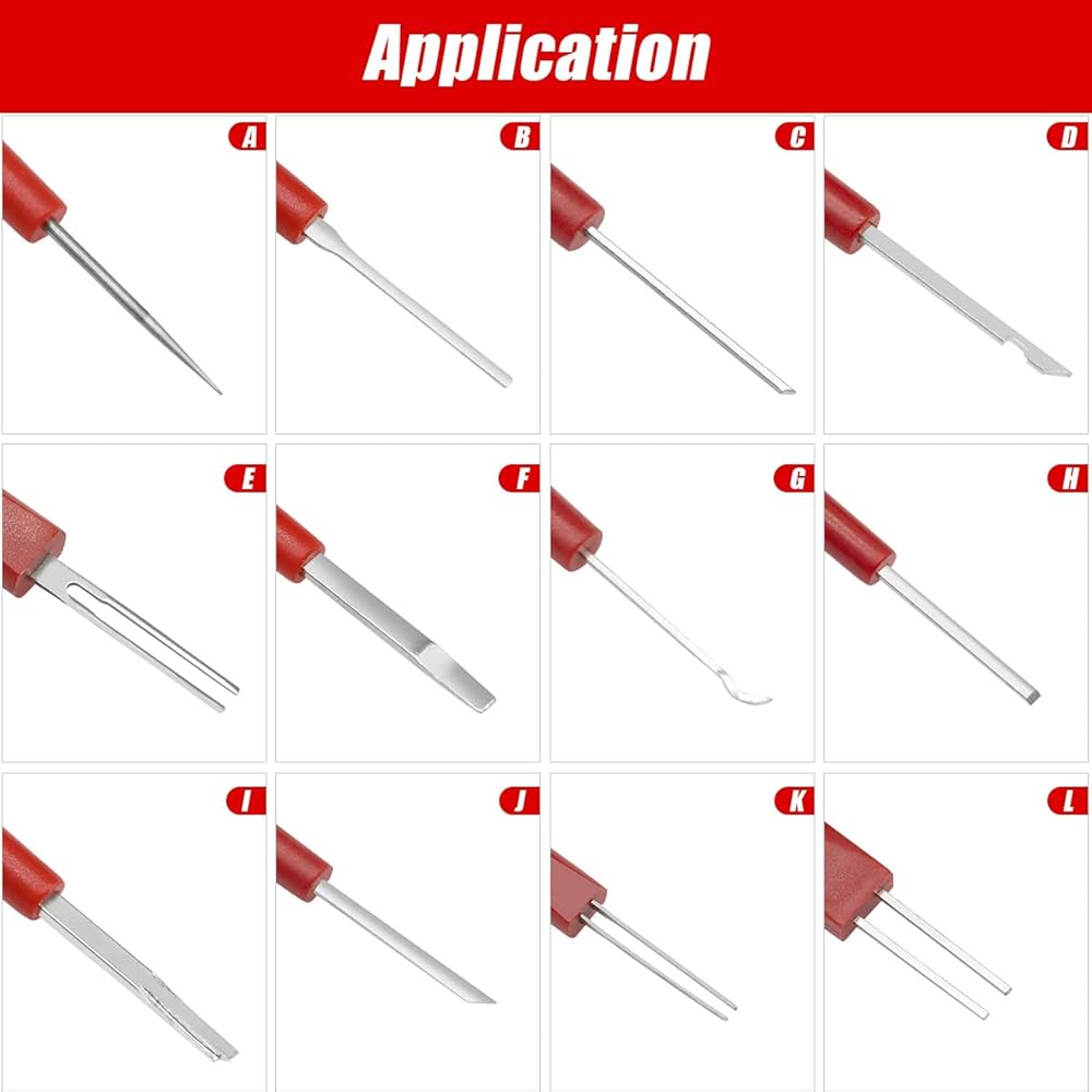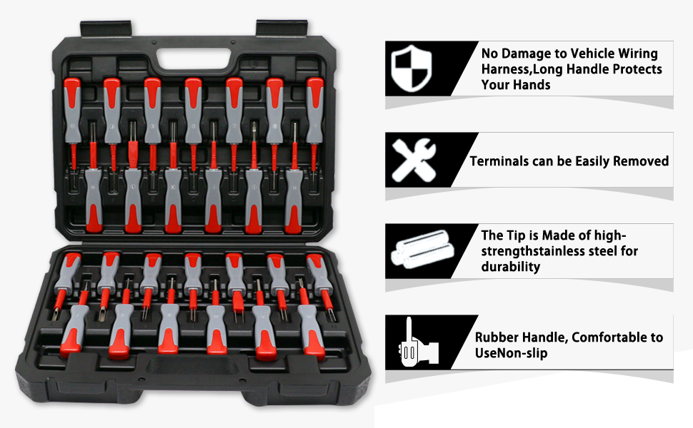 الإنتاجية: وفر الوقت وقلل الضرر الذي يلحق بالنظام الكهربائي لسيارتك باستخدام مجموعة أدوات إزالة الدبوس الكهربائية الخاصة بنا. قم بإصلاح الأسلاك المفردة في مجموعة أدوات بدلاً من استبدال مجموعة الأسلاك الكاملة باهظة الثمن. مثالي للاستخدام في حالات الطوارئ على جانب الطريق وكذلك المرآب الاحترافي. في مجموعة متنوعة من تطبيقات السيارات، يكون تصميم الجهاز هو توفير العمل، وفك الغلاف من القابس البلاستيكي ووضعه في قالب النفخ للتخزين والنقل.