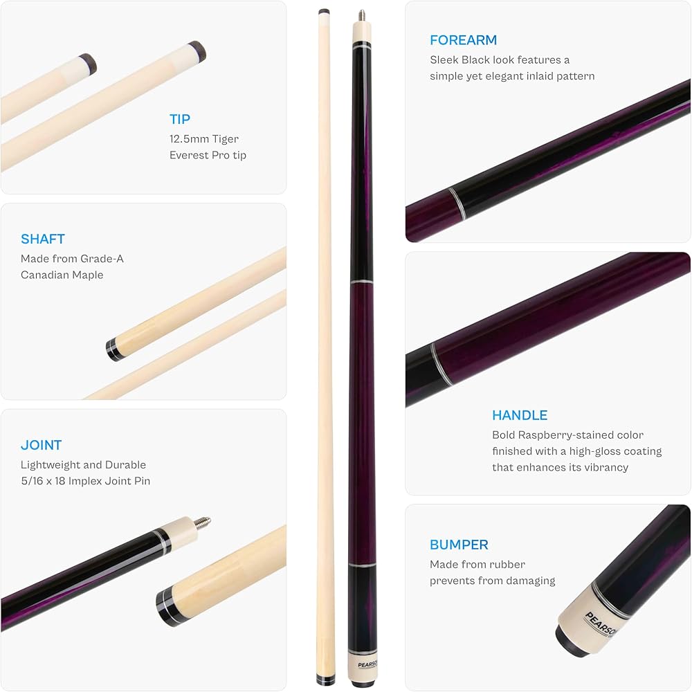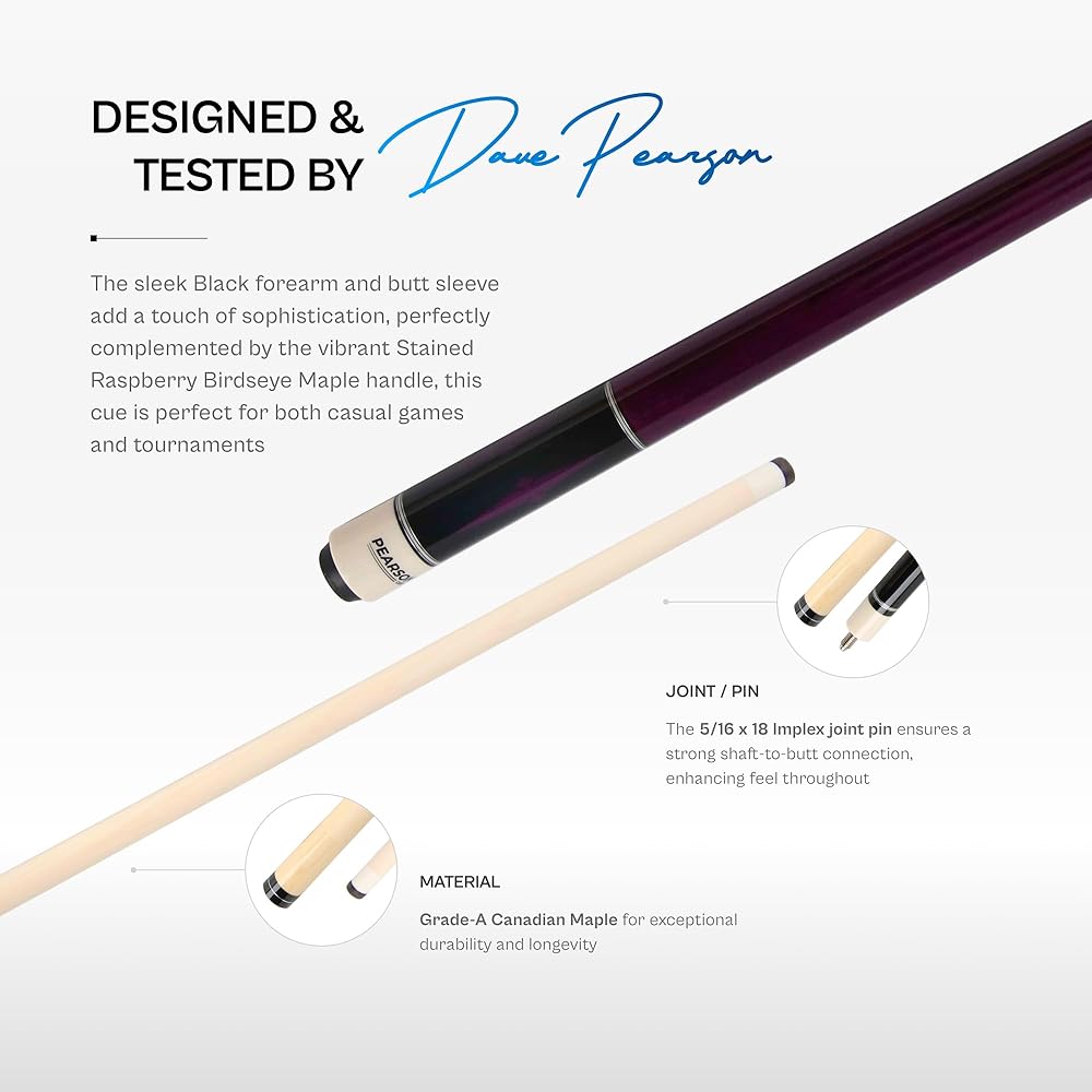 The Players Series PP pool cues by Pearson Cues are a true representation of what a quality billiard cue should be. They are crafted from the highest quality woods and finished with a professional-grade high gloss lacquer. The 12.5 mm solid Canadian Maple shaft is equipped with a pro taper and a Tiger Everest Pro tip atop a white composite ferrule. These cues are also weight adjustable in 1 oz increments from 18 to 21 oz. Pearson joint protectors are included to protect the 5/16 x 18 threaded stainless steel joint.